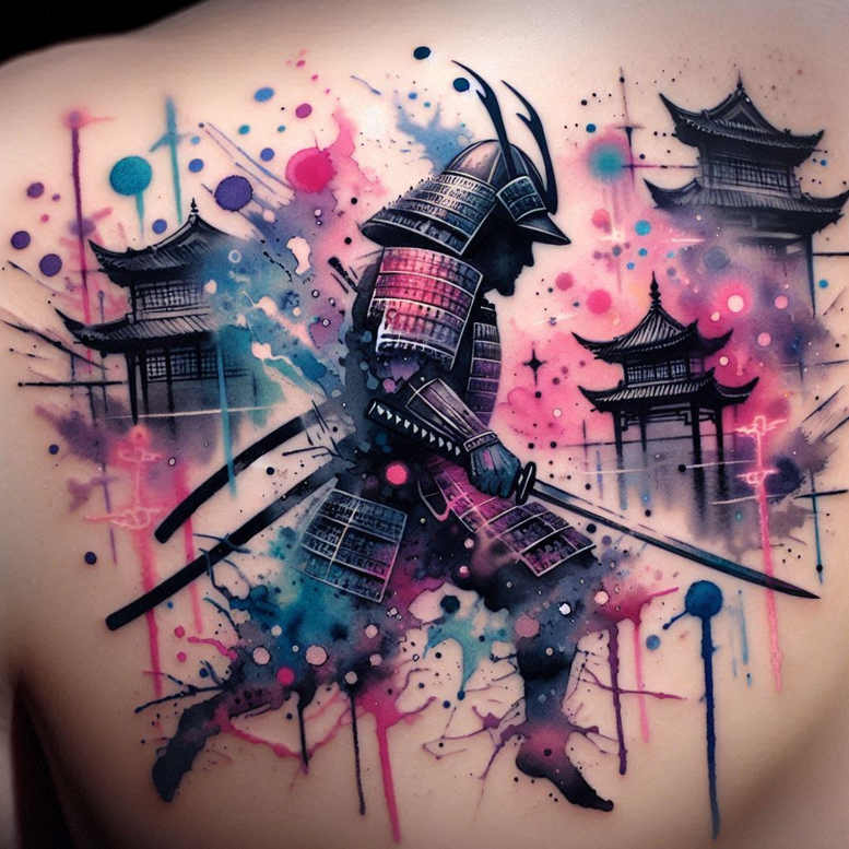 This AI-generated tattoo project concept presents a bold watercolor interpretation blending Japanese motifs with contemporary splash artistry. At its center stands a samurai figure in segmented armor, helmet crest and plates rendered with crisp black linework to preserve legibility while a riot of pink, blue, and purple washes breathes life into the scene. Two katana blades cross at the figure’s hip, their blades catching light against a backdrop of pagoda silhouettes that drift through soft mist and extend toward the edges of the composition. The painterly splashes are irregular, creating a dynamic pattern of droplets and drips that frame the warrior and echo the motion of combat and travel between worlds. The color language—blue, pink, and violet—provides contrast against the ink outlines, producing a vibrant tattoo design that remains readable on various placements. This concept nods to Japanese style tattoo aesthetics while embracing abstract expressionism; the piece balances realism in the figure and architecture with freer splash-driven background, achieving a harmonious integration of line and color wash. The work invites contemplation of discipline and resilience, with motifs that speak to heritage and modern body art. As a starting point for a custom tattoo design, the concept allows artists to adjust line weight, color balance, and pattern density to honor skin tone and anatomy while preserving the piece’s energetic mood. The inclusion of patterned splashes and structured pagodas anchors the composition, providing a readable silhouette from a distance and a rich tapestry of details up close. Keywords like tattoo, tattoo design, meaningful tattoos, fine line tattoo, lotus flower tattoo, infinity tattoo, tribal tattoo, rose tattoo design, small tattoos, flower tattoos, custom tattoo design, Japanese style tattoo, black and grey, realistic tattoo, body art, and ink are woven throughout to support search visibility while remaining faithful to the artwork’s spirit. Given the vibrant color palette and bold silhouette, this concept can be adapted to different body areas and scales, from shoulder to back, while preserving the central samurai narrative and the architectural motifs that give the piece its distinctive rhythm.