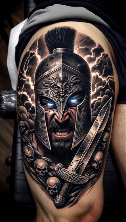 AI-generated tattoo project concept presenting a high-contrast Spartan helmet in black and grey, anchored by a blade and encircled by skulls; blue eyes glow behind the visor while storm clouds and jagged lightning crackle in the background. The helmet’s ornate crest and geometric bands echo ancient Greek motifs, giving the piece a pattern-rich texture that reads as realism and myth. The shading builds deep blacks and smooth gradients to carve the helmet, blade, and skulls from the skin, while precise highlights on metal surfaces create a sense of weight and edge. The composition uses strong contour lines and strategic negative space to maintain legibility on larger canvases such as the upper arm or shoulder, and the dense blacks and careful placement of light areas also make it well-suited for a cover-up of an older tattoo; the design can be adapted to smaller areas while preserving its impact. It blends elements of tribal and Japanese-influenced patterning in the helmet bands with classic Western warrior imagery, yielding a tattoo design that feels timeless and formidable. The piece is intended as a bold, statement-making tattoo design suitable for meaningful tattoos about strength and mortality; work with a skilled artist to translate the ink into a finish that holds both detail and longevity on skin; it sits squarely in the realm of black and grey realistic tattoo and custom tattoo design, ideal for those seeking large-scale body art that communicates resolve through iconic motifs such as armor, blades, and skulls; AI-generated tattoo project concept.