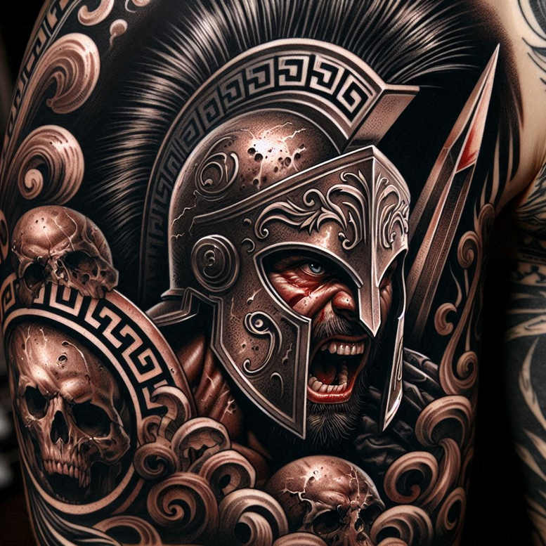 This cover-up-oriented concept presents a helmeted warrior tattoo rendered in black and grey realism, with dense shading and crisp linework that defines metallic surfaces, engravings, and dramatic contrasts. The central motif is a stylized Corinthian helmet, its faceguard framing a snarling expression; surrounding elements include a round shield etched with a Greek-key pattern, and several skulls interwoven with ornamental scrolls. The composition relies on layered black washes and fine line details to create depth, texture, and motion, allowing darker areas to mask previous ink work while preserving legibility of the new design. The wearer’s beard and visible portions of the jaw add human warmth against the cold steel, while sharp highlights along the helm suggest movement and power. The ornate patterns function as both decorative and symbolic devices: the shield’s motif alludes to protection and endurance, the skulls speak to mortality and conquest, and the roaring posture embodies courage and struggle. The piece leverages contrast to enhance legibility on darker skin tones and can be adapted in scale for forearm, back, or chest canvases; its dense black shading supports a highly effective cover-up over prior tattoos, particularly old dark inks or large black areas. From a technique perspective, the artist uses smooth gradations of black and grey ink, bold outlines for readability, and subtle stippling to render texture on metal and bone. Collectors seeking meaningful tattoos may interpret the helmet as discipline and honor, the skulls as mortality confronted, and the pattern as timeless symmetry; as a custom tattoo design, it sits at the crossroads of realism and mythic symbolism, making it suitable for Japanese-style influences or a purely Western heroic aesthetic. This AI-generated tattoo project concept demonstrates how digital ideation can inform bold, durable body art, while remaining adaptable to different body contours and line thickness requirements; the design aligns with trends in black and grey ink, fine line tattoo accents, and larger statement pieces, and it remains a prime candidate for a cover-up due to its intricate density and aggressive shading.