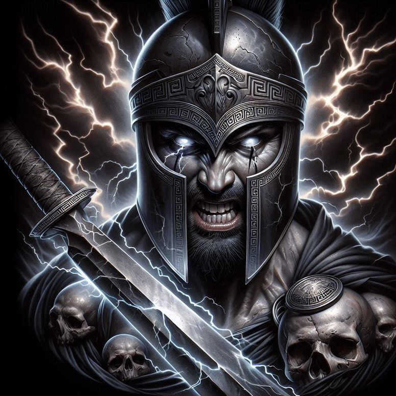 This dark, high-contrast tattoo design presents a helmeted Spartan warrior rendered in a near realistic style with dramatic lighting and electric energy. The central figure wears a bronze toned helm carved with a geometric band in a Greek key motif, its surface weighty and convincing under sharp highlights. A fierce expression and furrowed brow convey the resolve of a battle hardened hero, while a diagonal blade crosses the chest, its edge fractured by jagged blue white lightning that threads through the metal and pours into the surrounding shadows. Lower on the torso, a cluster of skulls peeks from drapery and armor, adding macabre weight and a reminder of mortality that deepens the tattoo symbolism. The armor plates are sculpted with precise chisel like shading and soft gradient transitions, creating a tactile sense of depth as if the image could be inked onto skin as a body art study. The composition balances hard angular lines with subtle gradients, giving the piece a dynamic rhythm and making it suitable for large scale placements such as back or chest. Lightning streaks in the background frame the hero, while the helmet pattern anchors symmetry and adds a geometric cadence within the tattoo design. The motif channels classical myth and modern fantasy aesthetics, delivering a meaningful tattoo concept for those who seek strength, courage, and fate in their ink. This project is presented as an AI generated tattoo project, a reminder of contemporary digital artistry that translates well into a high impact tattoo design for real skin. The color treatment leans toward black and grey with electric blue accents, allowing a skilled ink artist to adapt the piece to pure black and grey realism or to a bold full color rendition if desired. For clients considering a cover up, the dense composition, bold line work, and strong shading offer excellent potential to mask older artwork, while preserving crisp geometry from the Greek key helmet band to the blade edge, making it an ideal cover-up tattoo design that still reads clearly and dramatically in any scale.