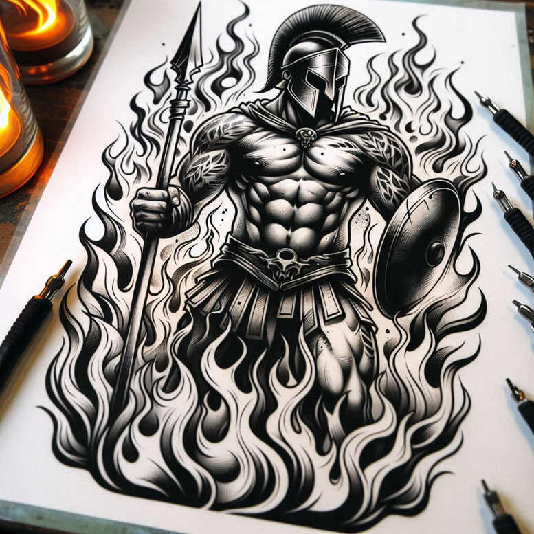 An AI-generated tattoo project presented as a bold black-and-grey illustration of a gladiator warrior. The central figure wears a classical helmet with a crest, stands defiant with a spear in one hand and a rounded shield in the other. The anatomy is sculpted for a dramatic, heroic read: broad shoulders, tight abdominal lines, and carved musculature that communicates strength and discipline. Flames surge around the legs and torso, weaving into a pattern that frames the warrior and doubles as a dynamic backdrop. This flame motif reads as a graphic pattern while maintaining clear ink lines, making the design versatile for a cover-up or new tattoo placement. The shading blends solid blacks with carefully graded grays to produce depth, contrast, and texture on skin. Key details—helmet vents, spear point, shield curvature, and a belt with ornamental elements—anchor the piece in a mythic yet contemporary vibe, suitable for a wide range of ages and body areas. Symbolically, the gladiator evokes courage and endurance; the fire symbolizes purification, transformation, and energy that endures through adversity. The composition aligns with modern tattoo design language while nodding to classical heroic iconography, delivering a meaningful tattoo concept for those seeking a bold statement. It is adaptable to small or large scales and can be rendered in highly detailed or streamlined forms, depending on aesthetic goals. As an AI-generated tattoo project, it demonstrates how algorithmic creativity can translate a powerful motif into a practical, ink-ready design; the result remains legible, durable, and expressive in black and grey ink. This description intentionally weaves in tattoo design keywords—tattoo, tattoo design, meaningful tattoos, fine line tattoo, lotus flower tattoo, infinity tattoo, tribal tattoo, rose tattoo design, small tattoos, flower tattoos, custom tattoo design, Japanese style tattoo, black and grey, realistic tattoo, body art, ink—to enhance discoverability for artists and clients alike.