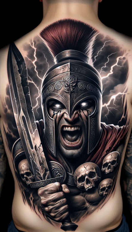 This AI-generated tattoo project presents a high-contrast black and grey back piece centered on a furious Spartan helmet gripping a broad sword, with skulls clustered across the chest and jagged lightning sweeping the background. Rendered in hyper-realistic shading and smooth gradations, the helmet’s ornamentation features classical scrollwork and metal plates, while the blade shows chipped edges and reflective highlights that suggest brutal force. The composition uses dense inkwork to create depth, with negative space around the figure to emphasize its power and motion. The helmet, sword, and skulls form a stark narrative about leadership, discipline, mortality, and the price of war, while the pattern-rich armor engravings add texture and rhythm. The skulls anchor the piece and hint at mortality and battle-readiness, reinforcing the meaning of resilience under pressure—a meaningful tattoo for someone seeking strength and resolve. Techniques include meticulous linework for the armor engravings, black-and-grey blending of skin tones, and high-contrast shadows to give the helmet a three-dimensional presence on the wearer’s back; the lightning in the background adds drama and helps separate the foreground from the background. The design emphasizes pattern through repeated engravings and metallic textures, making it visually striking as body art. As a cover-up solution, the dense shading and black fills provide opacity to conceal prior tattoos while preserving legibility of the foreground elements. Although rooted in warrior iconography, the piece is adaptable to large back canvases and can be aligned with tattoo design trends for meaningful tattoos, black and grey realism, and custom tattoo design; it also nods to Japanese-style influences and tribal touches for a bold, contemporary look in ink. Note: these projects are AI-generated tattoo concepts intended to inspire a tattoo artist’s interpretation and refinement for a final installation.