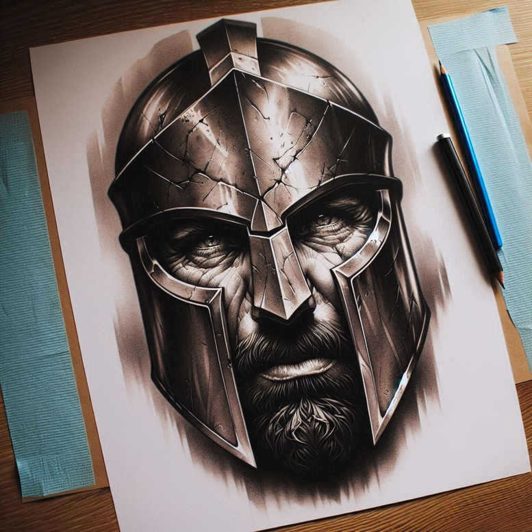 This is an AI-generated tattoo project concept showcasing a black-and-grey study of a gladiator helmet. The composition centers on a cracked metallic helm that frames a stern, shadowed gaze and a short beard, all rendered with graphite shading to mimic a polished surface. The contrast between deep blacks and soft midtones creates a realistic metal look, while crisp linework defines the helmet’s edges and panels. The drawing sits on white paper with visible studio tools nearby—pencils, masking tape—placing the piece firmly in a traditional artist’s study context. As a potential tattoo design, the image reads as a bold, cover-up-friendly concept: the dense shading and strong silhouette can conceal earlier ink while delivering a striking centerpiece for the upper arm, back, or chest. This description embeds the tattoo’s meaning—protection, resilience, and lineage—through the gladiator motif, inviting interpretations tied to personal history. It also demonstrates the role of AI in skin-art ideation: an AI-generated tattoo project concept that translates into a realistic black-and-grey tattoo design, leveraging patterns of fractures in metal to inspire line work and negative space.