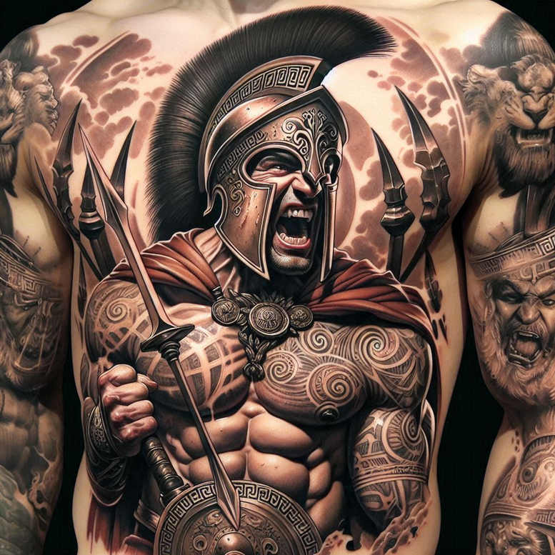AI-generated tattoo project presented as a bold, black and grey, realistic gladiator scene that sweeps across the torso. The focal point is a muscular warrior wearing a Roman helmet with ornate embossed patterns, a broad cuirass, and a dramatic red cape that cinches at the shoulders and flows across the chest. The warrior grips a long spear in one hand while a round shield rests near the opposite hip, forming a powerful, action-packed silhouette. Surrounding this central figure are graphic pattern elements—spiral swirls, Greek-key borders, and tessellated shading—that add texture and depth without sacrificing legibility on skin. The skin tone variations are achieved with smooth gradient shading, crisp linework, and dense black ink that create a multi-layered sense of volume, as if the armor, metal, and fabric jump from the surface. The tattoo design leans into realism while embracing stylized motifs, matching the look of a large-scale body art piece suitable for a cover-up or a full-back style extension. The composition emphasizes strength, courage, and mythic heroism, making it a meaningful tattoo choice for clients seeking a narrative piece with cinematic impact. If the aim is a cover-up, the dense black field and high-contrast elements provide excellent concealment of previous work while offering a striking, modern silhouette. Key elements include helmet, spear, shield, cape, torso, armor, spirals, borders, and warrior faces. This project showcases the best practices in black and grey tattooing: precise linework, smooth shading transitions, and thoughtful placement to honor the anatomy.