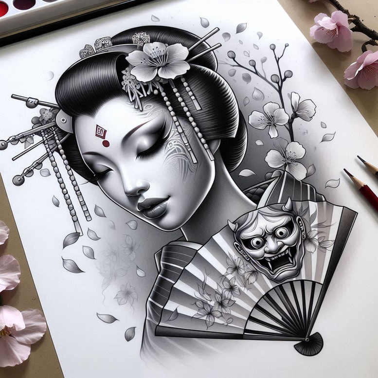 This is an AI-generated tattoo project concept, presented as a refined template for a black and grey tattoo design inspired by Japanese aesthetics. The composition centers on a geisha portrait rendered in grayscale, with an ornate updo accented by hairpins, while a folding fan crosses the shoulder and reveals a stylized demon mask, introducing a tension between grace and power. Surrounding elements include delicate flowers and drifting petals, creating a dynamic counterpoint to the bold geometry of the fan and the smooth shading of the geisha’s skin. The piece emphasizes pattern work throughout—intricate lines, ornamental curves, and lattice-like textures that invite bold ink and repeatable motifs. Technically, the design leans toward fine-line tattoo aesthetics, using crisp lines for facial features and hair ornaments, coupled with solid black areas to convey depth in hair and the mask. The grayscale palette enhances the realism of skin tones and wood, ensuring durability on skin while maintaining a timeless appeal. Symbolically, the geisha embodies grace, discipline, and artistry; the demon mask hints at hidden facets or dual identities; blossoms symbolize fleeting beauty and renewal. The composition accommodates pattern-rich layouts, offering placement flexibility on the arm, back, or calf, and is well-suited for a potential cover-up where existing ink requires concealment or integration. For clients seeking meaningful tattoos, floral symbolism, and cultural motifs, this concept provides a strong reference for a custom tattoo design, whether for a small piece or a larger body of ink, and complements Japanese style tattoo traditions, black and grey realism, and refined body art.