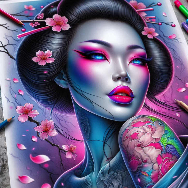 AI-generated tattoo project presents a geisha-inspired portrait dominated by a blue-grey skin tone, electric blue eyes, and neon magenta makeup that blends into bright pink lips. The composition places the face at center stage while black hair frames the features, and delicate sakura blossoms drift on slender branches around the head. A vibrant tattoo sleeve peeks from the arm, rendered in a kaleidoscopic mix of pinks, greens, and blues with floral forms and flowing patterns that echo traditional Japanese motifs. The piece blends a contemporary neon palette with meticulous line work and shading to create a luxurious, high-contrast look that reads as both tattoo design and body art. The technique emphasizes crisp contours, smooth color gradients, and subtle skin-toned overlays to simulate depth and dimension. Symbolically, sakura blossoms suggest renewal and beauty, while the geisha figure conveys grace and mystery, making this a meaningful tattoo concept for a wearer seeking a statement piece or a cohesive sleeve. The piece demonstrates how fine line technique can pair with bold color blocks to produce a pattern-rich sleeve that remains readable at both close and distance views, ideal for viewers interested in modern, expressive ink as part of a custom tattoo design. As an AI-generated tattoo project, this artwork showcases the potential of digital collaboration with tattoo artists to explore Japanese-style tattoo ideas, floral tattoos, and contemporary ink aesthetics, offering a compelling choice for a large-scale tattoo design or as a vibrant, bold enhancement within a larger body art plan.