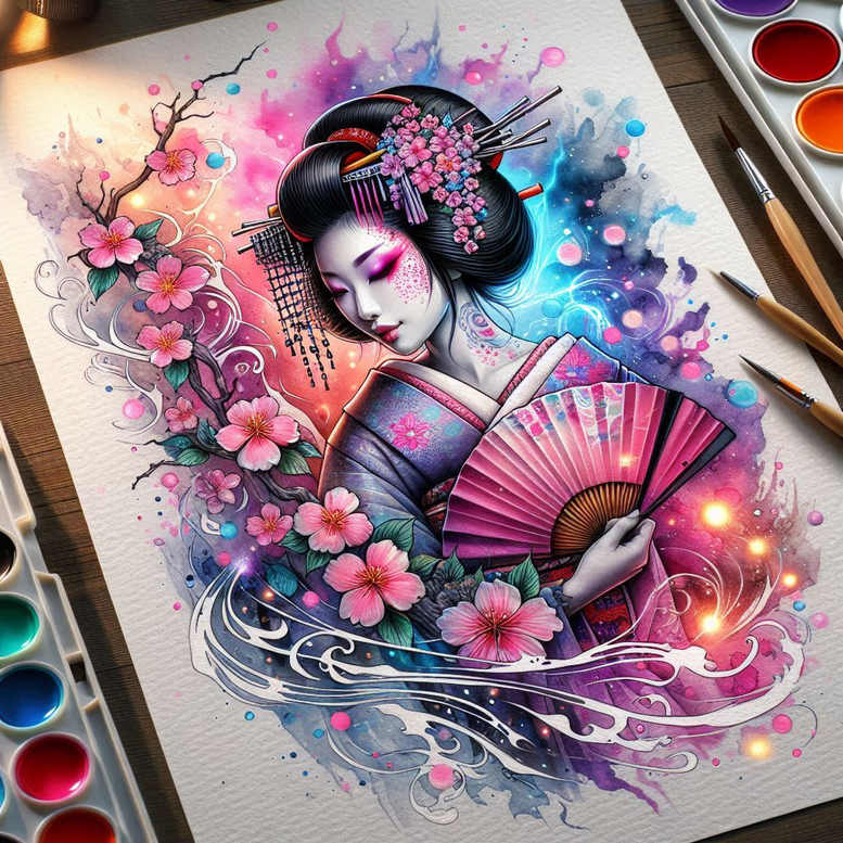 Geisha-inspired portrait rendered in a luminous watercolor tattoo concept, this piece centers on a serene geisha with eyes closed, framed by a pink fan held in her right hand. The hairstyle is an elegant updo accented with small kanzashi-like hairpins and delicate floral studs, while cherry blossoms and curling vines weave around her neck and shoulder, balancing the composition between soft organic forms and the geometric rhythm of the fan’s pleats. The palette relies on pinks, purples, and electric blues that bleed into the skin with translucent gradations, reflecting the fluidity typical of watercolor tattoo designs. Fine line work accents the features and hair ornaments, while bold color washes create depth and a sense of movement, as if incense smoke or water currents are trailing behind the figure. The background dissolves into a splashy field of color with white highlights and subtle halo effects, producing a dynamic contrast with the controlled linework of the subject. The kimono suggestion is expressed through folded fabric tones and a light floral motif, suggesting texture and drape without overpowering the face. This concept leans into Japanese-inspired aesthetics with a contemporary twist, celebrating symbolism—blossoms representing fleeting beauty, the fan implying concealment or revelation, and the geisha embodying grace and mastery of craft—making it a meaningful tattoo design for those seeking elegant body art. The piece is designed for both large-scale applications, like a back or sleeve piece, and smaller placements using refined linework and selective color blocking. It underlines tattoo design principles such as negative space, color harmony, and silhouette clarity, and is intended as an AI-generated tattoo project concept, illustrating how a painted image can translate into a wearable form. For future shoots or revisions, the artwork offers a flexible framework: keep the blossoms prominent as a floral motif, maintain the watercolor wash approach for a modern look, and use the fan as a focal point that anchors the composition. Keywords such as tattoo, tattoo design, meaningful tattoos, fine line tattoo, lotus flower tattoo, infinity tattoo, tribal tattoo, rose tattoo design, small tattoos, flower tattoos, custom tattoo design, Japanese style tattoo, black and grey, realistic tattoo, body art, and ink guide the treatment and presentation of this concept in a professional context.