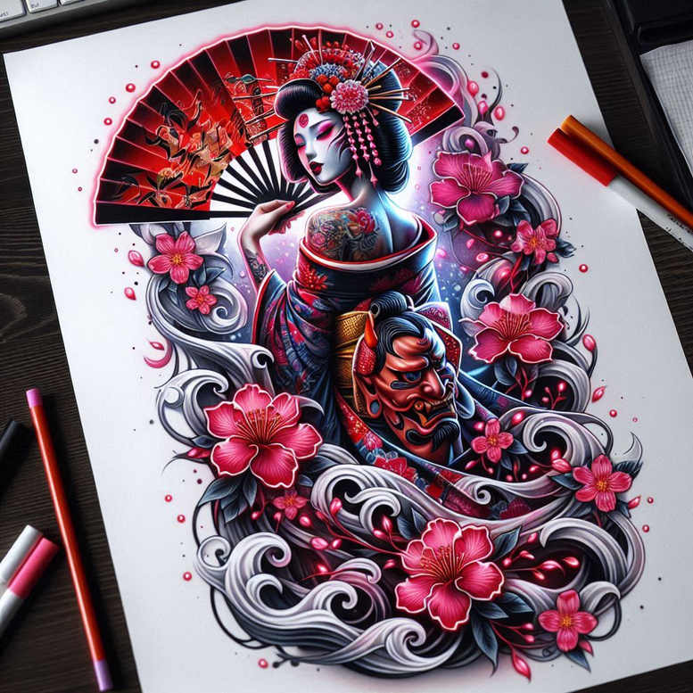 These AI-generated tattoo projects explore a bold Japanese-inspired composition. The design centers on a geisha in a lacquered kimono, her serene face framed by ornate hair ornaments, and a poised posture holding a dark fan that fans out behind her. A red oni mask rests at her side, introducing a contrast between grace and ferocity. Surrounding them, swirling waves and ribbons of water weave through clusters of pink hibiscus blossoms, while curling tendrils echo the movement of wind. The color palette is saturated: electric pinks and magentas alongside deep blues and inky blacks, applied with clean linework and solid color fills to achieve a graphic yet refined look. The design blends traditional Japanese motifs with contemporary tattoo technique, offering a meaningful tattoo design suitable for a larger piece or a stand-alone statement. Elements such as the geisha, fan, oni mask, blossoms, and waves provide rich symbolic potential: grace, beauty, transformation, protection, and the balance of softness with strength—a popular theme in meaningful tattoos. Technique-wise, the piece favors a mix of bold outlines and smooth gradient shading, with careful attention to contrast to maintain legibility on skin over time. Because the waves and flowers form a continuous rhythm around the central figures, the tattoo design can be adapted to fit forearm, calf, or back placements, making it a versatile concept for a custom tattoo design. The work also demonstrates how pattern-inspired motifs can be integrated without sacrificing clarity, ensuring the final ink remains legible as it ages. This project showcases how full-color ink can render intricate linework and bold color fills in a Japanese-style composition, offering a bold alternative to more muted black-and-grey renditions. AI origin: These are AI-generated tattoo projects, illustrating how digital artistry can inform client-ready tattoos with strong visuals and meaningful symbolism.