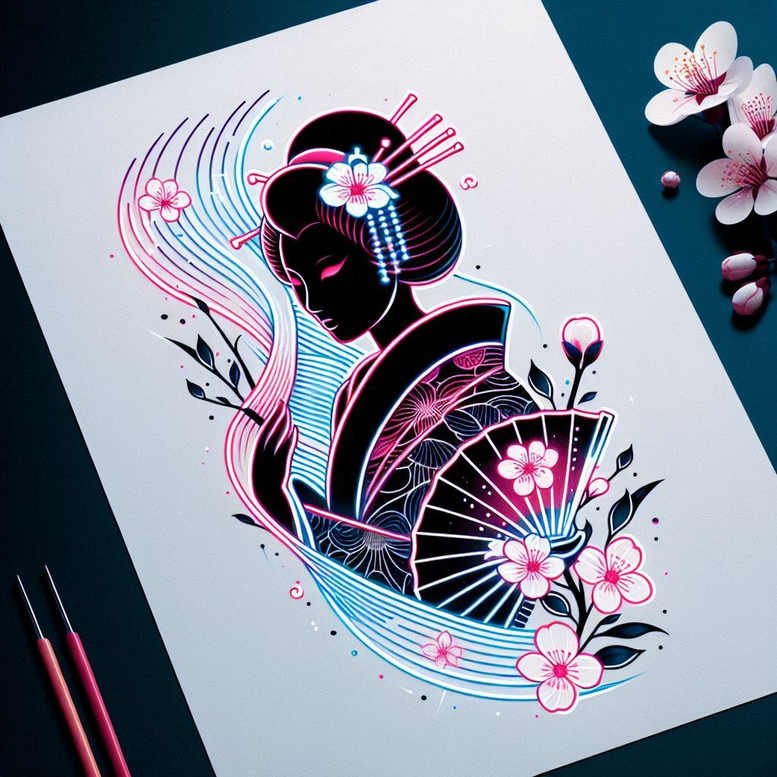 These are AI-generated tattoo projects, offering a bold, contemporary reinterpretation of a classic Japanese motif. The concept centers on a Geisha silhouette rendered in solid black, its form accented by neon pink and electric blue highlights that trace the kimono seams, obi, and flowing hair. A stylized fan unfolds beside the figure, its spokes and pleated folds echoing arcs of wind and motion. Cherry blossoms spill across the composition, their pale pink petals punctuating the negative space and balancing the heavy black silhouette. The piece relies on crisp lines, high contrast, and a deliberate rhythm between broad shapes and fine details, ensuring legibility on skin even at smaller sizes. The design lends itself to a classic black-and-grey foundation if preferred, yet the neon palette invites bold color work for full-color tattoos, leveraging skin tone to amplify the glow of pinks and blues. The motifs are layered: geisha as an emblem of grace and resilience, the fan as a symbol of mystery, and blossoms as reminders of transience and beauty, which allows the piece to carry a personal narrative or homage. Pattern work inside the kimono and on the fan adds texture and cohesion, creating visual interest that travels from shoulder to forearm or calf. The composition accommodates placements from compact forearm pieces to larger back or thigh canvases, with a clear silhouette ensuring crisp definition against light skin and vibrant color accents for a modern edge. As a cover-up-oriented concept, it is well-suited to concealing older tattoos beneath a bold, high-contrast design that can be refined into a cohesive body of work.