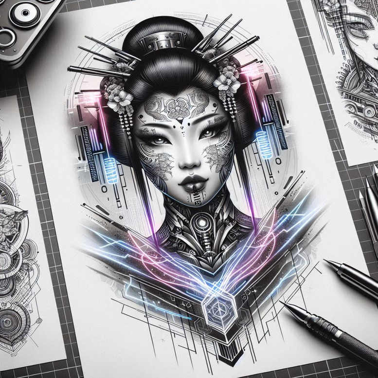 An exploration of a bold, AI-generated tattoo project that merges the delicate precision of fine line techniques with a cybernetic aesthetic. The subject is a geisha-like portrait rendered in black and grey ink, its serenity disrupted by a lattice of circuitry that overlays the cheeks, temples, and throat. The hair is scripted into a traditional updo, adorned with stylized metal headpieces and floral accents, creating a juxtaposition between soft portraiture and machine-age geometry. The technical core sits at the neck and chest: a tessellated mesh of plate-like forms, hexagonal motifs, and cable-like lines that converge into a central, jewel-like crest. Neon accents in pink and blue radiate along the circuitry, emphasizing the energy flow and giving the composition a sense of motion without overpowering the restrained grayscale shading. The composition relies on crisp line work, negative space, and controlled shading to maintain legibility across scales; the geometry around the shoulders and sternum forms a modern frame that echoes both Japanese tattoo sensibilities and graphic, cyberpunk design. The piece reads as a narrative of dual identities—heritage and futurism, tradition and technology—while remaining accessible as a meaningful tattoo design. In terms of technique, the artist balances fine line work with bold, architectural shapes and subtle dot shading to create depth and texture, a hallmark of black and grey realism fused with graphic circuitry. The motif’s meaning can be read as a celebration of resilience and identity, with the circuitry symbolizing connectivity and the geisha honoring a refined aesthetic. For collectors seeking meaningful tattoos that pair elegance with innovation, this design doubles as a striking small-to-medium piece that can be scaled and adapted; as an AI-generated tattoo project, it also showcases the potential of digital ideation to inform custom tattoo design, while remaining practical for skin art that ages well. Patterned circuitry provides a visually engaging motif that translates across body locations, and the neon accents guide the eye along the lines, reinforcing the tattoo’s contemporary edge.