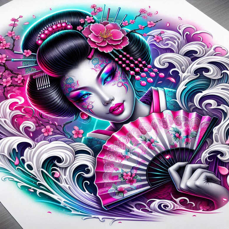 An AI-generated tattoo project presents a vibrant, Japanese-inspired geisha depicted in a glowing palette of magenta, cyan, and violet. The composition centers on a serene geisha face framed by an elaborate coiffure and kanzashi hairpins, her gaze softened by bold, blue-toned eye makeup. In her hand, she grips a folding fan painted with pink blossoms that echo the surrounding floral motifs. Surrounding elements surge in stylized waves and swirling mist, weaving together traditional Japanese iconography with contemporary neo-traditional shading. The art relies on crisp linework and smooth color transitions to create a dynamic sense of motion, with luminous highlights that give the image a lacquered, tattoo-ready finish. The piece reads as a full-color tattoo design with strong graphic contrasts and layered details, making it suitable for a statement sleeve or back piece for a collector seeking meaningful tattoos that celebrate beauty, resilience, and cultural symbolism. The geisha embodies elegance and mystery, the fan suggests privacy and guarded beauty, the blossoms symbolize fleeting life and renewal, and the waves convey power and fluidity. Each element is rendered with a careful balance between literal depiction and decorative pattern, inviting close inspection of the petals’ gradients, the hair’s lacquered shine, and the fan’s cherry blossom motif. This is a modern take on Japanese style tattoo, blending traditional subject matter with contemporary color theory and digital rendering techniques. The design can be adapted as a cover-up option when a bold, colorful layer is desired to mask previous ink, though its bright palette and complex lines can also be kept as a standalone centerpiece for bold body art. Note that these are AI-generated tattoo projects, ready for refinement by a skilled tattoo artist. Keywords such as tattoo, tattoo design, meaningful tattoos, fine line tattoo, lotus flower tattoo, infinity tattoo, tribal tattoo, rose tattoo design, small tattoos, flower tattoos, custom tattoo design, Japanese style tattoo, black and grey, realistic tattoo, body art, ink are present to highlight the breadth of modern tattoo practice.