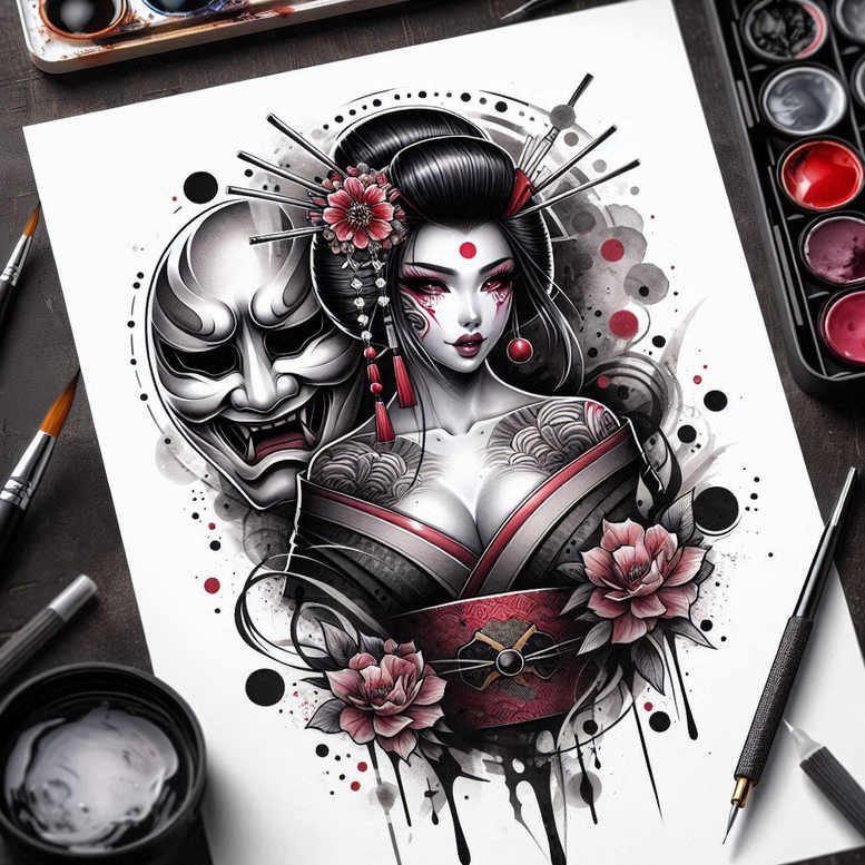 This AI-generated tattoo project presents a Japanese-inspired portrait that fuses a Geisha with an Oni mask in a bold black-and-grey palette accented by crimson and pink blooms. Executed in high-contrast realism with fine line precision, the piece places the geisha at the center of a circular medallion of dot-work and ink splatters, creating a dynamic negative-space frame that feels both traditional and contemporary. The geisha’s porcelain skin is carved with subtle shading along the cheek, lip, and forehead dot, while her hair is inked in meticulous strands that surge into ornate hairpins and a floral crest. The Oni mask lounges behind her on the left, its contours defined by smooth grayscale gradients and crisp lines that contrast the softness of the blossoms. The obi sash wraps around a stylized chest and torso, its red accents providing a punctuating color rhythm that resolves into tattoo-typical motifs: scalloped edges, geometric patterns, and a central clasp that anchors the composition. Surrounding elements—peony-like flowers in pink, irregular splashes, and a circular halo of specks—add movement and depth, guiding the eye through the scene as if it were a study in ink on skin. The symbolism is rich: the geisha embodies grace and discipline; the Oni mask represents guarding spirit and mystery; together they speak to dualities such as beauty and danger, tradition and innovation. The piece lends itself to a large, bold placement but remains adaptable to smaller panels through its crisp line-work and modular motifs. In terms of technique, expect smooth black-and-grey shading, fine-line contours, dot-work fill, and controlled splatter that mimic watercolor without compromising legibility on skin. This makes it a meaningful tattoo design for lovers of Japanese style tattoo, black and grey realism, and flower tattoos; it can also function as a cover-up sketch thanks to its dense shadows and strong contrast. Given the complexity, it benefits from a skilled artist who can preserve the fine lines and convert the digital concept into a wearable ink, resulting in a striking piece suitable for sleeve or back work. As an AI-generated tattoo project, it demonstrates how digital illustration translates into skin-ready design, offering a rich palette of textures, motifs, and symbolic potential for clients seeking a custom tattoo design that blends tradition with modern artistry.
