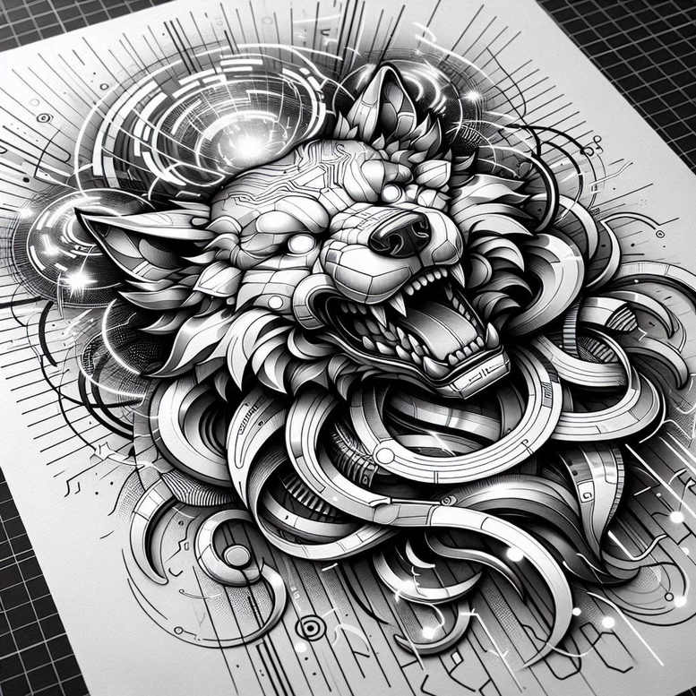 This piece presents a bold, high-contrast grayscale composition that fuses feral wildlife with cybernetic geometry. The central motif is a snarling wolf head rendered in black and grey ink, its teeth bared and eyes vacant, captured with dense cross-hatching and crisp highlights that give a piercing, lifelike presence. Surrounding the head, winding ribbons twist and loop, creating a dynamic sense of motion while guiding the viewer toward the beast’s features. Interlacing with the organic form are circuit-like motifs—circles, lines and segmented bands—that resemble a digital halo, giving the design a futuristic edge without sacrificing legibility as a tattoo concept. The linework moves from bold outlines to fine internal detailing, producing a layered effect that reads cleanly at both small illustrations and larger canvases. The composition makes strong use of positive and negative space, with deep blacks anchoring the piece and lighter grays allowing subtle transitions in value. This tattoo design is presented as an AI-generated tattoo project, illustrating how algorithmic concepting can yield intricate, scalable ink ideas that translate well to a real-world skin piece. The pattern-heavy approach blends graphic geometry with organic form, ensuring the work reads as both a fierce animal portrait and a modern, cyber-inspired tattoo design. Its symbolism centers on strength, loyalty, and resilience, with the wolf embodying guardianship while the circuit ribbons hint at personal evolution and technology’s role in identity. For practitioners, the piece offers a versatile foundation for a larger forearm or back work, and can be adapted to black and grey, fine-line styles or Japanese- or tribal-influenced motifs as desired. In short, this is a striking, meaningful tattoo concept that emphasizes a cover-up-ready, high-contrast aesthetic suitable for bold body art collections and ink-ready applications.