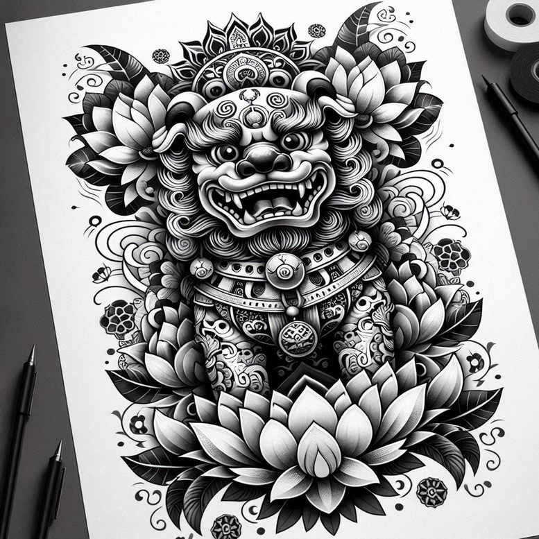AI-generated tattoo project: this intricate black and grey design presents a mythic guardian lion rising from a lotus bloom, executed with dense line-work and graphic patterning. The lion’s snarling expression and flowing mane are defined by crisp outlines and deep shading, creating three-dimensional volume that holds the eye. A ceremonial collar adorned with circular medallions and bead-like motifs encircles the creature, nodding to East Asian iconography and traditional tattoo symbolism. Surrounding the guardian are layered lotus blossoms and petals; their geometry interlocks with curling vines and micro-patterns that add texture and rhythm. The pattern work is deliberate and graphic, giving the piece a dynamic sense of movement while maintaining legibility on skin. High contrast between pure blacks and mid-tones pushes the lion forward, with the lotus forms receding into a softer grey backdrop—an arrangement well suited for large placements or as a bold standalone statement. Technique-wise, the piece relies on bold outlines, solid fills, smooth gradient transitions, and fine interior line-work to convey fur texture, leaf vein, and petal veining. The black and grey palette reinforces a timeless aesthetic compatible with modern or traditional tattoo contexts; symbolism centers on protection, strength, purity, and rebirth, making it a meaningful tattoo concept and a strong candidate for a custom tattoo design. Medallions contribute rhythm and decorative balance, guiding the viewer’s eye around the composition. Although AI-generated, the concept reads as a ready-to-tattoo artwork created by a professional designer, and the heavy dark areas make it especially suitable for cover-ups, providing substantial ink coverage while preserving intricate detail. For a client seeking a formidable flagship piece for the back, chest, or sleeve, this design offers scale and adaptability without sacrificing clarity at various sizes. In short, the tattoo design blends traditional guardian symbolism with contemporary graphic pattern, delivering a bold, meaningful work of black and grey body art.