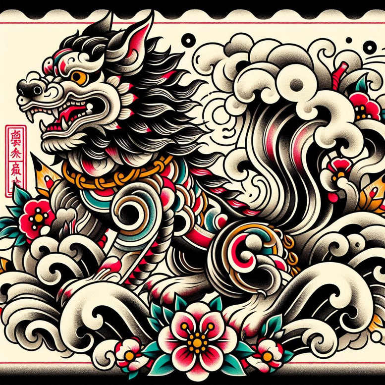 This tattoo design presents a traditional Japanese dragon spiraling through stylized waves and tumbling clouds, anchored by a cluster of peony blossoms. The line work uses bold black outlines and smooth grey shading to create dimensional depth, while selective color hits—crimson on scales, teal accents, and pink highlights—bring the composition to life. The dragon’s mane and scales are rendered with a rhythmic pattern of swirls and serrated edges that emphasize movement, while the waves curl in crisp ribbons and the clouds drift in soft billows, providing negative space that maintains legibility on larger canvases. The peony flowers anchor the scene with lush petals and bright centers, symbolizing prosperity, honor, and beauty within a martial balance of fierce energy and delicate detail. This bold, graphic design reads as a cohesive pattern across the skin, suitable for back, sleeve, or chest placements where the motifs can breathe and interlock. From a technical perspective, the piece relies on strong contrast between black ink and grey shading to create volume, with careful color placement to avoid muddiness in high-use areas. The composition integrates traditional motifs with a modern touch, preserving legibility when scaled and ensuring longevity of line work. Symbolically, the dragon embodies protection and courage; the waves denote perseverance; the peony stands for wealth and honor. The patterning is deliberate, producing a harmonious rhythm that can be expanded into a larger narrative, making it an ideal candidate for a custom tattoo design.