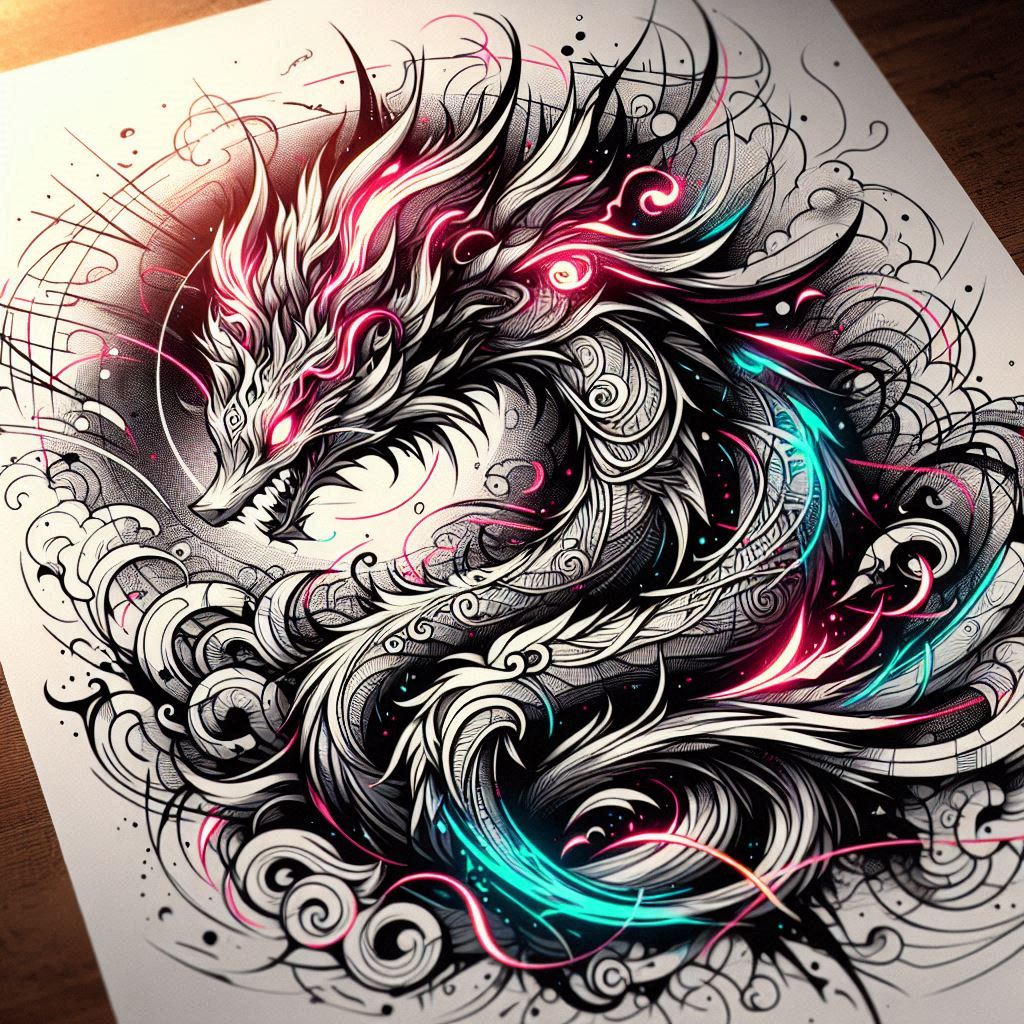This AI-generated tattoo project presents a dragon-inspired design rendered in dense black-and-grey linework, with luminous neon pink and cyan accents that weave through scales and curling tendrils. The composition emphasizes movement and texture: a dragon’s head in sharp relief, serrated snout, and teeth, followed by flowing filigree and spirals that swell into intricate scrollwork. Patterned shading, stippling, and cross-hatching layer depth, giving a kinetic energy that reads as fierce yet refined. The fine line technique preserves crisp edge definition while the bright accents provide focal points against the grayscale field. Symbolically, dragons signify strength, wisdom, and protection, while the looping motifs nod to cycles and infinity, enriching this tattoo design with personal meaning for those seeking meaningful tattoos, small tattoos, or flower-and creature hybrids. The piece nods to Japanese style and tribal influences through its ornamental composition, yet remains contemporary thanks to bold contrast and neon pops. For a cover-up, the dense black fill and layered shading offer strong concealment and a bold canvas to rework existing ink. As an AI-generated concept, it demonstrates how modern body art can fuse traditional symbolism with graphic technique, yielding a striking black-and-grey dragon tattoo that will age well and remain legible. This design is a versatile template for a custom tattoo design, balancing pattern, motion, and meaning in a single, high-impact composition. The artwork invites interpretation as protector, cosmic serpent, or mentor—yet its immediate impact as a tattoo design is undeniable.