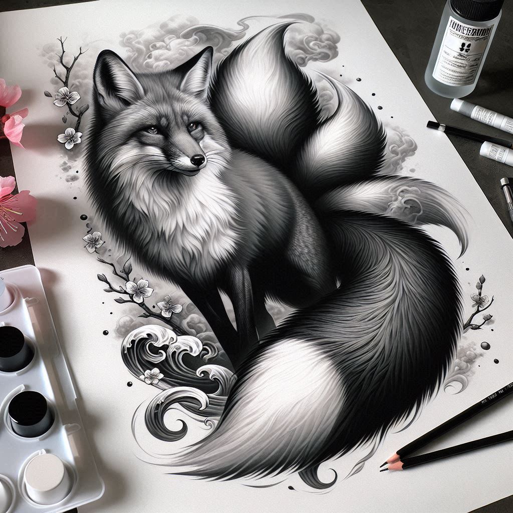 This grayscale fox concept sits poised among delicate blossoms and curling waves, rendered in black and grey with a refined fine-line approach. Soft gradient shading and crisp micro-work evoke fur texture, cloud-like mist, and tidal swirls that fuse into a cohesive scene on skin. The fox’s alert expression and sweeping tail convey intelligence and elegance, while the blossoms symbolize renewal and the waves introduce motion and rhythm. The composition balances natural motifs with graphic patterning, making it versatile as a standalone tattoo or a cover-up extension when needed, with careful placement to preserve or mask existing ink. Execution emphasizes realism within a black-and-grey palette, using layered shading and high contrast to keep the focal figure readable over time. For those seeking meaningful tattoos, the concept merges symbolism of cunning and grace with botanical and oceanic elements to evoke harmony between land and sea. It functions well as a custom tattoo design for fans of fine-line techniques, flower tattoos, and Japanese-style silhouettes, yet remains suitable for small tattoos as well. As an AI-generated tattoo project concept, it illustrates how digital artistry translates into ink-ready design language, offering a template that respects anatomy, skin texture, and aging of the ink. The design uses pattern-rich lines for the fox fur and the flowering branches, allowing the work to translate to delicate or bold tattoo styles based on placement. The narrative behind the fox—grace, adaptability, stealth—coupled with blossoms and waves, provides a timeless symbolism ideal for meaningful tattoos and personal stories. Keywords woven through include tattoo, tattoo design, meaningful tattoos, fine line tattoo, lotus flower tattoo, infinity tattoo, tribal tattoo, rose tattoo design, small tattoos, flower tattoos, custom tattoo design, Japanese style tattoo, black and grey, realistic tattoo, body art, and ink, boosting discoverability for contemporary portfolios.