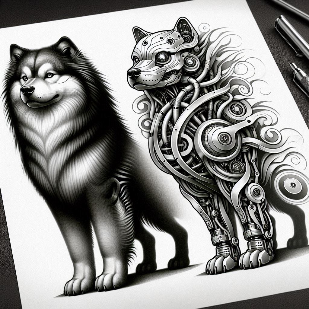 This tattoo design pairs a lifelike dog portrait with a cybernetic anatomy, rendered in black and grey with meticulous shading and high-contrast linework. The left half presents a realistically textured canine head and torso, capturing fur flow, whiskers, and a calm, confident expression. The right half dissolves into mechanical components—gears, tubes, pistons, and circular hubs—interwoven with cables and plates in a seamless transition that suggests transformation rather than conflict. The piece relies on smooth grayscale gradients to produce depth, with bold shadows anchoring the limbs and lighter highlights detailing reflective metal surfaces. The juxtaposition of organic form and machine geometry creates a narrative about dual identity, resilience, and the merging of nature with technology. The circuit-like motifs function as a pattern, echoing modern tattoo aesthetics while remaining legible when scaled to small sizes. The design embraces both realism and stylization, allowing for variations in line weight and shading to suit individual skin tone and placement. The left canine’s expression remains calm and observant, while the robotic anatomy conveys precision and strength, inviting interpretation about loyalty, memory, and future progress. Technically, the concept emphasizes clean separation between components and careful alignment of the shoulder, neck, and ribcage to preserve anatomy. The composition relies on negative space and reflective symmetry to balance the organic and mechanical halves. This is an AI-generated tattoo project concept and reflects current trends in black and grey realism and biomechanical fusion. It is particularly well-suited as a cover-up where bold silhouette and dense shading can mask existing tattoos while preserving detail in the new design. For ink application, the motif can be scaled for forearm, thigh, or calf, with optional extensions such as lotus flower tattoos, infinity symbols, or tribal influences while preserving the core concept of a custom tattoo design that speaks to meaningful tattoos and contemporary Japanese style tattoo aesthetics, all within the black and grey palette.