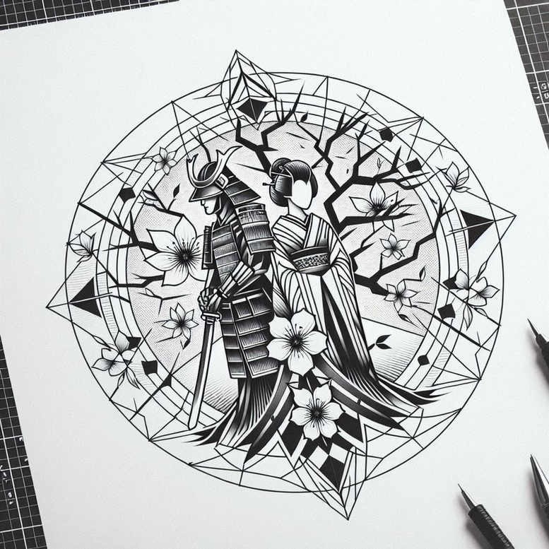 Rendered as a precise black-and-grey linework tattoo, this design places a samurai and a geisha within a circular geometric frame that reads like a modern mandala. The figures stand side by side, the samurai clad in traditional armor with a crisp katana at his side, while the geisha bears a flowing kimono whose folds ripple with stylized grace. Surrounding them, sakura blossoms float among the branches, creating a delicate counterpoint to the martial bearing and ceremonial poise of the characters. An outer network of triangles and diamonds forms a complex geometric pattern that folds into the circle, giving the piece a contemporary edge while preserving classic Japanese style influences. The circle serves as a symbol of unity and cyclical life, while the blossoms hint at transience and renewal, themes often embraced in meaningful tattoos. The artist uses fine line technique and selective shading to create depth without heavy fill, allowing the black ink to convey texture in armor plates, silk fabric, and crane-like flower petals. This tattoo design balances fierce strength with refined beauty, offering a narrative of harmony between tradition and abstraction. Intended for a larger canvas such as the forearm, upper arm, back, or chest, it can be scaled and adapted for smaller work but benefits from ample space to maintain line integrity and pattern clarity. The piece integrates multiple motifs—samurai, geisha, circular silhouette, geometric pattern, blossoms—into a cohesive whole that speaks to collectors of Japanese style tattoo, black and grey, and fine line tattoo techniques. As an AI-generated tattoo project, it demonstrates how digital concept art can inform a custom tattoo design that remains timeless in body art ink. Patterns and careful geometry are central to the composition, making this a striking, meaningful choice for anyone seeking a well-crafted tattoo design.