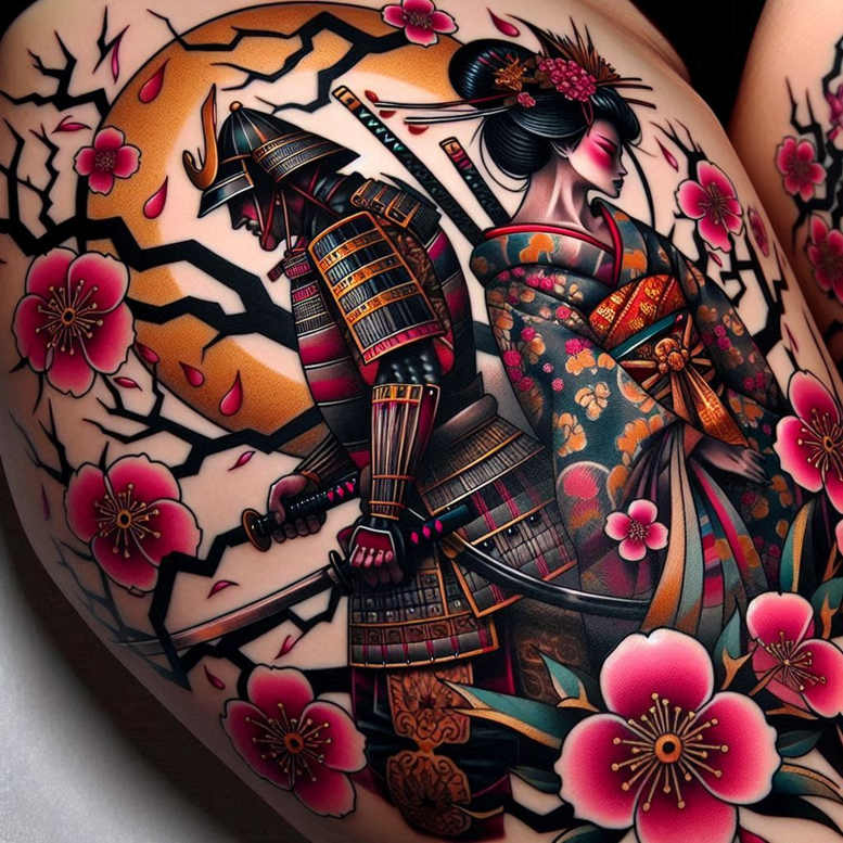 This AI-generated tattoo project explores a bold Japanese-style composition that pairs a samurai in lacquered armor with a geisha in a teal kimono, framed by sakura blossoms and stark black branches against a radiant sun. The artwork demonstrates a high-contrast full-color palette and crisp line work that define the lacquered armor plates, the textile motifs on the kimono, and the delicate petals of the blossoms. The samurai’s armor features lacquer-like shading, gold trim, and fine micro-patterning that recall traditional samurai fittings, while the geisha’s hair is styled with kanzashi and her makeup is softly shaded to convey quiet grace. The background branches carve through negative space, creating dramatic contrast with the vivid foreground and unifying the circle of the sun with the figures. Symbolically, the image fuses strength and beauty: duty and art, discipline and expression, with sakura blossoms signaling the transient nature of life. The design invites interpretation as a meaningful tattoo that speaks to balance, honor, and growth, and it remains adaptable for large canvases such as a back or shoulder piece or as part of a sleeve. As an AI-origin concept, it demonstrates how traditional Japanese motifs can be reimagined for contemporary ink while preserving authenticity through palette and motif. For readers of tattoo culture, this piece aligns with keywords like tattoo design, meaningful tattoos, fine line tattoo, Japanese style tattoo, and flower tattoos, while also offering rich opportunities for a custom tattoo design approach in black and grey or full color, depending on client preference. Although expansive and bold, the composition also serves as a study in pattern—the repeating floral and branch motifs weave through the scene, reinforcing unity and rhythm across the artwork. This project reflects the idea that ink can tell a narrative, combining heritage and modern craft to produce a stand-out piece of body art that looks as compelling on skin as it does in design concepts.