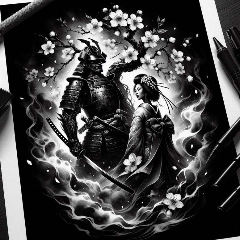 This AI-generated tattoo project presents a dramatic black-and-grey composition pairing a samurai in layered armor with a geisha in a flowing kimono, surrounded by blooming blossoms and curling wisps of smoke. The figures stand in profile, swords drawn, with the samurai’s lacquered plates and the geisha’s hair ornaments rendered in precise line work and smooth tonal shading to create a bold yet refined silhouette against a deep ink field. The swirling vapors and scattering petals weave around the pair, linking armor, fabric, and nature into a cohesive narrative of honor, beauty, and contrast. The technique emphasizes crisp edge definition and subtle gradient transitions characteristic of black-and-grey realism, while nodding to traditional Japanese motifs and contemporary tattoo design sensibilities. This tattoo design marries macro drama with intimate detail: armor plates receive micro-etching texture, kimono fabrics show delicate folds, and blossoms provide soft focal points guiding the eye through the composition. Cherry blossoms symbolize renewal amid conflict; swords imply protection and resolve, and the geisha’s serene expression counterbalances the samurai’s imposing stance, suggesting partnership rather than opposition. For clients seeking meaningful tattoos with narrative depth, this piece offers a versatile canvas suitable for large-format back or chest work, while scaling gracefully to smaller runs with thoughtful proportioning. As an AI-generated tattoo project, it demonstrates how digital concept art translates into a custom tattoo design with crisp linework, shading, and a striking, high-contrast presence. Given its pronounced black ink and dense composition, it serves as an excellent cover-up solution, capable of masking older imagery beneath while preserving the blossoms and figures in sharp relief. In short, this design blends iconic imagery with technique to deliver a tattoo design that invites personal symbolism and cross-genre appeal, from Japanese style influences to modern black-and-grey realism, making it a strong choice for meaningful tattoos and body art.