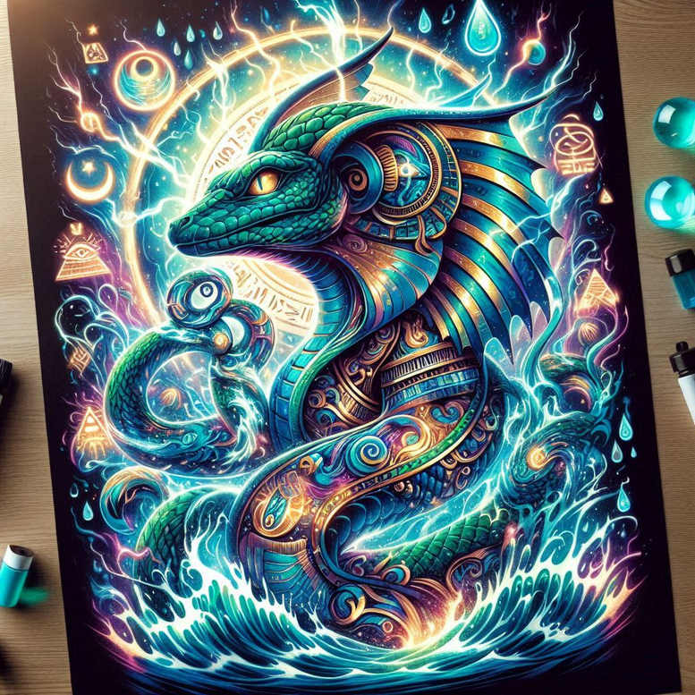 An opulent Sobek-inspired tattoo design unfolds as a neon dragon-crocodile hybrid that swirls across the skin, its body sculpted with meticulous linework and an abundance of scales that shimmer in electric blues and teals. The composition pairs a curving torso with a cresting tail, weaving through stylized waves that curl and splash, while translucent orbs hover along the arc like protective amulets. The color palette is saturated, favoring blues and teals to evoke the Nile’s waters, with luminous highlights that glow against a dark background. The artistry leans toward a modern illustrative tattoo style, combining bold outlines with intricate filigree patterns inside each scale and along the ribcage and fins. The meaning is central: Sobek, the Egyptian crocodile god of the Nile, symbolizes protection, strength, fertility, and the dangerous yet life-giving forces of water. By merging Sobek’s guardian presence with a dragon’s mythic vitality, the wearer embodies resilience and the capacity to navigate change, power channeled through currents rather than raging against them. The orbs may signify celestial guidance or protective charms, reinforcing the theme of balance between land and river. The waves anchor the piece in motion, suggesting perpetual transformation and the flow of time, while the ornate scalework alludes to timeless craft and the layering of meaning across eras. This tattoo design is a bold, color-forward statement suitable for a larger canvas and is ideal for meaningful tattoos celebrating protection, water, and myth. The concept is AI-generated as part of the design exploration, translating a digital concept into a vibrant real-world tattoo idea that benefits from strong color, contrast, and pattern repetition across the scales.