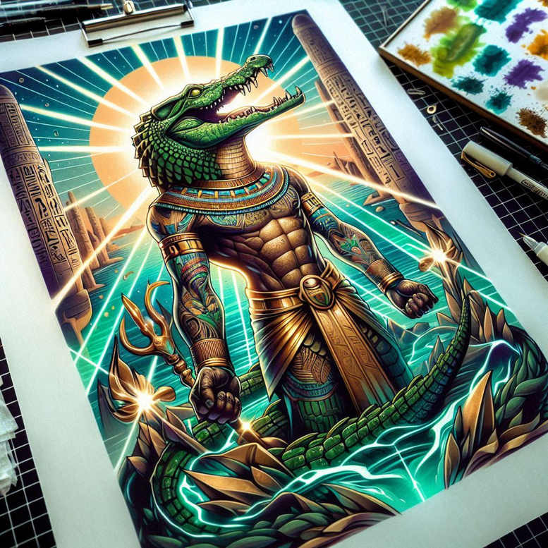 Sobek, the crocodile god of the Nile, is reimagined as a commanding deity in a contemporary tattoo gallery concept. This Sobek-inspired depiction centers a crocodile-headed figure adorned in ceremonial armor and a broad gold collar, with a gilded headpiece that gleams against a vibrant blue-green palette. A radiant sun halo blooms behind him, casting a halo of light that nods to Ra and the solar cycle while framing the figure in mythic radiance. The composition balances bold linework with saturated color blocks to ensure legibility as a tattoo design, even when rendered at larger scales or on curved anatomy. The repeating scale texture across the crocodile’s skin creates a subtle rhythm that echoes ancient mosaics and Egyptian ornament, while the serpentine sweep of limbs introduces motion and life. A stylized desert backdrop and faint hieroglyphs ground the scene in sacred geography, bridging ancient symbolism with a modern street-art sensibility. The color scheme—electric blues, turquoise, and warm gold—symbolizes the Nile’s depths, the vitality of life-giving waters, and the sun’s power; black outlines sharpen contrasts, producing a black-and-color tattoo aesthetic that reads clearly on skin. This design exemplifies a premium, custom tattoo design with meaningful tattoos in mind, suitable for a large canvas like the back, chest, or sleeve, and its pattern of scales provides graphic unity that translates well across panels. The Sobek motif serves as a protective emblem, a reminder of strength, resilience, and renewal in the wearer. Though presented here as a concept, the artwork is AI-generated as a modern take on mythic body art, inviting the wearer to add personal symbolism while retaining the image’s iconic gestures—crocodilian head, sun halo, ornate jewelry, and hieroglyph-inspired detailing.