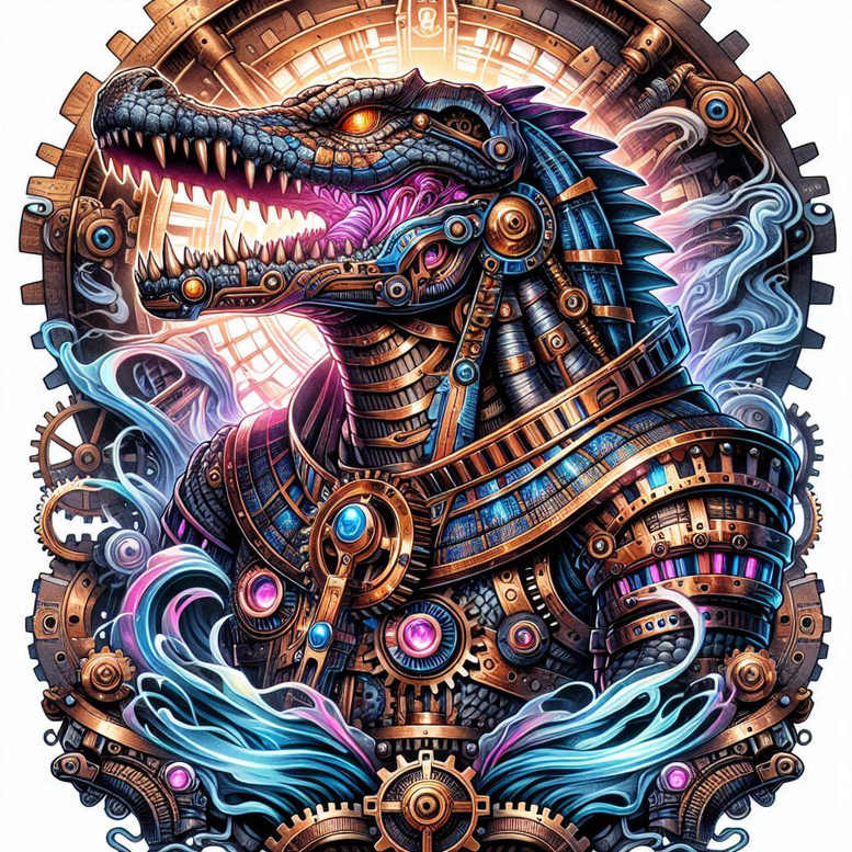 Presented as a vibrant tribute to Sobek, the crocodile-headed Nile deity, this tattoo design fuses ancient symbolism with a contemporary steampunk aesthetic. The central image is a formidable crocodile head, rendered in luminous color, wearing ornate armor plates, riveted joints, and gilded trinkets that evoke a ceremonial harness. Gears, cogs, and jewel-like orbs thread along the armor, suggesting a clockwork guardian forged for both mythic protection and modern adventure. Surrounding the figure, curling water wisps in electric blues carve space and motion, while a dark, textured background frames the creature as if perched within a sacred circular medallion. The color palette is deliberately saturated—copper, gold, violet, cobalt, and teal—creating a sense of ceremonial regalia and molten metal that catches light from multiple directions. The design leans toward a high-contrast, bold line quality with smooth gradient shading to simulate metallic surfaces, giving a finish that reads well in large-scale tattoo formats such as sleeves or chest panels. The Sobek symbolism signals power, protection, and primal resilience; Sobek was revered for Nile fertility and military prowess, and the crocodile represents stealth, dominance, and ancient wisdom; by pairing these symbols with gears and steam-era motifs, the piece speaks to a union of myth and mechanism, timeless strength married to human ingenuity. For the wearer, it embodies safeguarding energy, courage in the face of chaos, and the idea that ancient guardians can be reimagined through craft and technology. The motif also explores repeating patterns of gear-work across the armor, a nod to the pattern theme that creates rhythm and unity across the composition. Note: this design concept is AI-generated, presented here as a finished artwork for inspiration and study. In terms of placement, the composition suggests a bold, attention-catching centerpiece suitable for larger canvases, with a cover behind the character that allows the figure to breathe. In short, it is a statement piece that marries myth, machine, and color into a single unforgettable tattoo design.