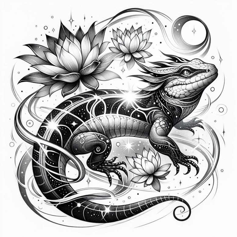 This Sobek-inspired tattoo design merges mythic symbolism with a refined black-and-grey aesthetic, presenting a crocodile-lizard companion that winds around a cluster of lotus blooms beneath a slender crescent moon and scattered stars. The fine-line technique renders the creature and botanical elements with delicate, interlacing curves, creating a sense of movement and balance that reads clearly at both close and distance views. The lotus petals rise in layered symmetry, evoking rebirth and spiritual awakening, while the Sobek figure anchors the piece with themes of protection, Nile waters, and ancient authority. The moon and stars introduce nocturnal mystery and cosmic order, guiding the gaze along the serpentine flow of water-inspired swirls that simulate currents and ripples—an ode to fluidity, adaptability, and the life-giving power of water. In the composition, negative space is intentionally used to emphasize key motifs, enabling the design to scale gracefully across the body, from forearm wraps to back pieces. Symbolically, Sobek embodies strength and guardianship; the crocodile-lizard hybrid emphasizes primal power with a protective undertone; the lotus represents purification, resilience, and rebirth; the lunar elements anchor the piece in time and mystery; and the water motifs connect to the Egyptian reverence for the Nile as life’s conduit. For collectors seeking meaningful tattoos, this design offers a custom-tattoo-design experience rooted in ancient myth while translating into a contemporary black-and-grey form suitable for everyday wear and deeper storytelling. The repeating lotus petals create a subtly patterned rhythm that enhances flow and can assist in concealing older ink, making this concept particularly practical as a cover-up; as an AI-generated design, it invites iterative refinements for placement and size, ensuring the final artwork remains timeless, sophisticated, and richly symbolic for body art enthusiasts.