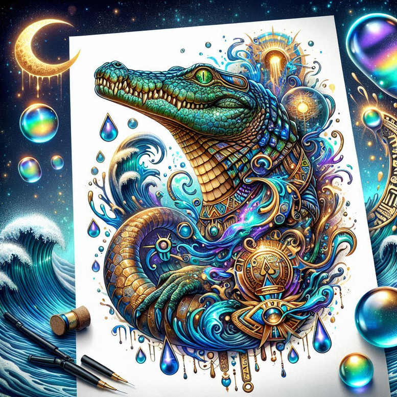 This Sobek-inspired tattoo design is a colorful, highly crafted portrait that merges ancient symbolism with contemporary ink art. A sinuous blue crocodile deity dominates the composition, its scales outlined in crisp lines and filled with luminous blues, teals, and hints of gold that catch light as the body coils through a stylized river of Nile imagery. Surrounding the creature, water motifs curl and splash in a rhythmic pattern, while bead-like ornaments and delicate jewels orbit the form, creating a sense of motion and reverence. The piece relies on fine line tattoo craft—thin, precise motorized strokes that define the creature’s musculature and the ornamental accoutrements without overwhelming the composition. In cultural terms, Sobek is the crocodile god of the Nile, associated with protection, power, fertility, and military prowess; this tattoo design channels those meanings by placing the deity at the center of a watery cosmos that symbolizes life, renewal, and divine guardianship. The rising and setting sun, a pale moon, and the glint of gold accents evoke the dual cycles of day and night and the sun’s life-giving energy, while the crocodile’s gaze invites the viewer to consider wisdom, vigilance, and enduring strength. The overall style blends Egyptian mythic iconography with modern, vector-inspired linework, producing a visually striking, gallery-quality tattoo concept suitable for a bold placement on the forearm or back. This is an AI-generated concept that acknowledges traditional symbolism while exploring contemporary composition and color theory, making it a meaningful tattoo design for those seeking a luminous, story-rich body art piece. Repeating scales and decorative motifs create a cohesive pattern that reinforces brand-like rhythm across the design, and the inclusion of water droplets and orbs adds sparkle and depth to the piece, ensuring it reads clearly from a distance yet rewards closer inspection with intricate detail. Sobek’s presence as protector and divine avertor of danger is reinforced by the surrounding aura of movement and light, making this tattoo design ideal for collectors of meaningful tattoos who value myth, craft, and cinematic color. The piece leans into a vibrant color palette rather than a monochrome approach, reinforcing the sense of life and energy while preserving readability on skin. For those exploring cover-up possibilities, the dense background and bold contours offer enough contrast to blend well with existing tattoos or to convert into a standalone centerpiece, further underscoring its versatility as a bespoke body art option.