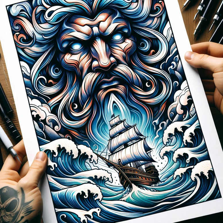 Poseidon, the god of the sea, dominates this color tattoo design with a stern, weathered face emerging from a roiling tempest of blue ink. The composition stacks a monumental head at the top, hair and beard sweeping into stylized curls that echo curling waves below, while a sailing ship fights its way through white-capped swells. Clouds swirl around the upper frame, creating depth and a sense of mythic height. The color palette relies on deep ultramarine, cerulean, and icy whites to convey ocean depth, spray, and motion, with bold black outlines anchoring the forms for a graphic, tattoo-ready read. This AI-generated concept offers a contemporary interpretation of Poseidon, balancing raw mythic symbolism with practical composition for body art. In terms of meaning, the piece speaks to mastery and protection of seafarers, channels the unpredictable energy of the sea, and invites viewers to consider voyage and fate. The waves symbolize perpetual change and resilience; the ship embodies adventure, risk, and the journey through life; Poseidon represents authority over water, storms, and fertility of the sea. As a meaningful tattoo design, it fuses classic myth with modern illustrative craft and optimized linework for a striking color piece that ages well with sun and skin tone. The work resonates with fans of bold illustration and color tattoos, while remaining readable from a distance and precise up close thanks to clear silhouette and shading. Within this design, repeating wave motifs create rhythm and cohesion across the scene, reinforcing the theme of sea power and navigation. The result is a powerful centerpiece suitable for a large canvas such as the upper arm, back, or chest, offering a vivid reminder of exploration, resilience, and inner strength. Symbolically, Poseidon carries the idea of flux and control—water as life and danger, the ship as a ferry between worlds. The color wash adds atmosphere; negative space around Poseidon’s silhouette preserves legibility when tattooed on skin. The design works as a custom tattoo design; it can be adapted into a sleeve with additional sea creatures, a compass, or coral motifs.