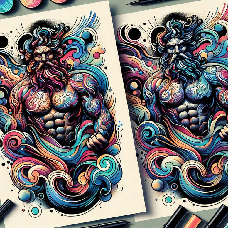 Poseidon-inspired sea god tattoo design presented in a bold, color-driven composition. The central figure is a muscular deity with flowing hair and a commanding stance, framed by curling ocean swells and frothy crests. The piece blends graphic linework with smooth color shading to convey movement, power, and mythic authority over the sea. A stylized trident anchors the composition, while stylized waves curl around the god, weaving in negative space and highlights that create depth on the skin. The color palette leans into deep blues, teals, and purples, with warm flesh tones to emphasize the figure and contrast against the aquatic backdrop. This tattoo design embodies classical mythological symbolism: Poseidon as master of oceans and storms, guardian of sailors, and emblem of renewal through the tides. The waves symbolize constant change, the trident authority, and the sea creatures or bubbles hint at life beneath the surface. The overall style blends contemporary illustrative technique with traditional tattoo motifs, resulting in a dynamic piece suitable for larger areas like the back or chest. The composition alternates between dense ink blocks and delicate linework to create a sense of energy and rhythm, mirroring the rolling sea. For meaning, the design communicates resilience, power, and a connection to the elemental forces of water. If this piece is used as a cover-up, the bold outlines and saturated color can help integrate existing marks while preserving the mythic imagery, though it remains a vibrant standalone work. The concept is a custom tattoo design that invites personalization—altering wave direction, pose, scale, or color warmth to tailor the meaning to the wearer. This is an AI-generated concept that showcases Poseidon-inspired iconography in a modern palette, confirming its place in contemporary tattoo design, ink, and meaningful tattoos.