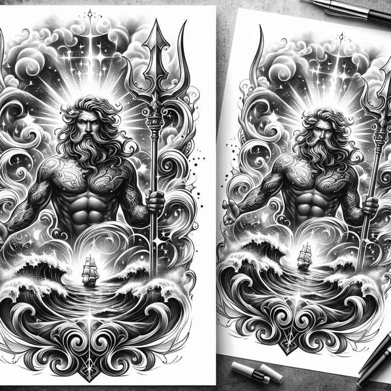 This AI-generated concept draws on Poseidon, the Greek god of the sea, reimagined in a black and grey tattoo design that fuses mythic power with ornamental precision in a twin-panel composition. The central figure is a muscular Poseidon, bearing a long trident as waves crash and curl around his form, while intricate filigree and scrollwork frame the scene like an antique nautical manuscript. The composition relies on high-contrast shading, with deep blacks anchoring the lower torso and limbs and lighter greys catching the crests of the waves, creating a sense of movement and depth that draws the eye toward the god’s gaze. The surrounding motifs function as a decorative border and repeating pattern, echoing spirals, shells, and ancient ligatures that amplify the sense of timeless myth and sea authority while giving the design a cohesive rhythm when used across two panels. In this tattoo design, the symbolism is intentional: Poseidon embodies power, mastery over tides, and protection for travelers and sailors; the trident symbolizes sovereignty and the ability to shape one’s own currents in life; the waves stand for resilience, change, and the journey through the deep; and the filigree pattern alludes to seafaring lore, suggesting that myth and memory are etched into skin as a personal talisman. The black and grey palette heightens realism and drama, enhancing the piece’s meaning and suitability for meaningful tattoos, while the fine line detailing and layered shading deliver texture and depth that reward close inspection. The repeating ornamental elements create a unifying pattern that supports cover-up potential, especially when layering over older ink; this makes the concept well-suited for large placements such as the back, chest, or upper arm where a bold silhouette can be appreciated from a distance and the intricate linework invites intimate study. As an AI-generated concept, it demonstrates how mythic symbolism and technical finesse can converge in contemporary body art, offering a versatile canvas for personal narrative while staying true to Poseidon’s legend.