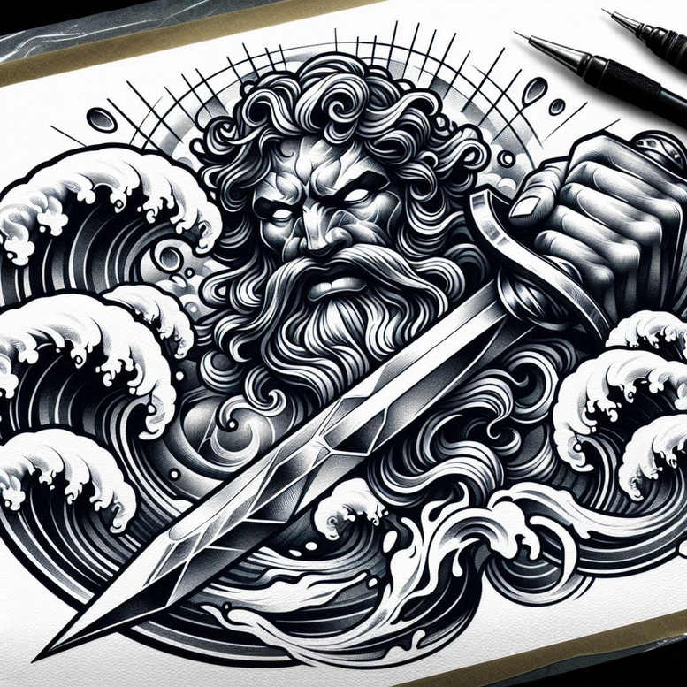 Poseidon-inspired waves and trident tattoo design: This entry in the gallery presents a dramatic black-and-grey concept rooted in Greek mythology, where mythic symbolism meets contemporary tattoo artistry. The composition centers on a robust trident that cuts across curling sea swells, while a stylized Poseidon figure emerges with a powerful presence, his beard and wind-swept hair rendered in sweeping strokes that echo the motion of the ocean. The artist uses high-contrast shading and precise linework to carve depth, letting teeth of foam and dark crests breathe under crisp outlines and soft gradients. Visually, the piece balances bold, plate-like shadows with delicate cross-hatching, producing a timeless look that reads well on larger areas such as the upper arm, shoulder blade, back, or chest. The waves become a living frame around the central icon, symbolizing change, resilience, and the capricious nature of the sea—an apt metaphor for navigating life’s storms with control and courage. Symbolically, the trident represents dominion over water and the elements, psychic strength, and protection for sailors and travelers, while Poseidon embodies leadership, depth of character, and a fearless embrace of the unknown. The motif also invites a broader interpretation for meaning tattoos, as it intertwines power, sovereignty, and a personal pact with the sea. Artistically, the black-and-grey palette creates a sophisticated, enduring aesthetic with dramatic silhouettes, ideal for fans of realistic tattoo or neo-traditional approaches; the design can be simplified for smaller tattoos yet retains its core message. The piece uses a rhythmic flow of waves that doubles as negative space to preserve skin healing and longevity, particularly when inked on bony or high-contrast areas. Because of the dense black areas and strong tonal ranges, this design is perfectly suited for a cover-up, allowing older ink or scar tissue to be concealed beneath the heavyweight shadows. It’s also noteworthy that this is an AI-generated tattoo concept, illustrating how machine-assisted design can fuse ancient myth with modern body art ethics and craft. In this light, the Poseidon theme resonates with many seekers of meaningful tattoos, black and grey ink, and custom tattoo design, offering a versatile template for personal narratives, whether as a large back piece or a leg sleeve, while maintaining a timeless, legible silhouette that stands the test of time as body art and ink.