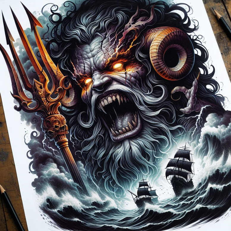 Poseidon stands at the heart of this inspired tattoo design, a commanding sea god who rises from a roiling, ink-dark ocean. His expression is fierce, his eyes glow with a fiery orange light, and his hair and beard flare with wind and spray as if caught in a tempest. In his powerful grasp he holds a gold-trimmed trident, its three prongs arcing upward and through the stormy air, a symbol of authority, mastery, and the precise control of the unpredictable sea. Surrounding him, waves crash and curl, rendered in deep black and grey shading with selective cobalt and teal highlights to suggest depth, motion, and the shimmer of foam. In the distance a sailing ship fights the swell, a narrative thread that hints at voyages, risk, and the human impulse to explore while respecting nature’s forces. The composition uses a bold, cinematic contrast: solid silhouettes against luminous, fluid highlights, with swirling line work that ties the figure to the water and sky in a cohesive circular motion. The cultural symbolism is deliberate: Poseidon as ruler of the oceans embodies power and protection, the trident stands for control and authority, while the sea and its storms symbolize change, resilience, and the journey through life’s inevitable upheavals. The ship anchors the personal story, reminding the wearer of trusted navigation through uncertainty. This design works on a large canvas such as the back, chest, or shoulder, where the dramatic scale can breathe and all details remain legible as the ink settles. Because the shading is dense and the palette employs substantial black, the tattoo reads as a cover-up option for existing tattoos, providing a powerful mythic layer over prior work while preserving the wearer’s skin integrity and future choice. Although presented here as a finished concept, this is an AI-generated tattoo design, intended to be customized with size, placement, and personal symbolism. Its meaning is clear and resonant: leadership, courage, and the ability to steer through stormy waters while honoring ancient sea lore, a narrative suitable for meaningful tattoos and for collectors who value mythic storytelling expressed in modern body art, with a balance of black and grey foundation and strategic color accents to create focal points and depth.