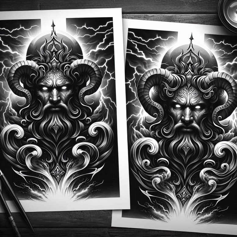 Poseidon-inspired two-panel portrait tattoo presented here unfolds as a masterful study in black and grey linework, where mythic power meets disciplined craftsmanship. The design centers on a horned, helmeted visage whose stern gaze anchors a cascade of curling waves and ornamental swirls that flow along the cheeks and neck. Rendered in fine line technique with bold contour and soft shading, the composition balances symmetry across twin panels, inviting a contemplative read from both sides. The symbolism is rich: Poseidon, lord of the sea, embodies authority, change, and protection; the waves symbolize the ever-shifting nature of water and the journey of life, while the horned helm hints at primal strength and guardianship. The repeating pattern of spirals and wave motifs creates a hypnotic rhythm, reinforcing the idea of continuity and resilience. In terms of style, the piece embraces black and grey realism and linework, aiming for a timeless look that pairs well with natural skin tones. As a meaningful tattoo design, it can function as a bold centerpiece or a complementary sleeve motif, especially for those seeking a connection to sea mythology and personal power. For readers considering ink as body art, this design exemplifies how fine line tattoo techniques can produce crisp detail at various sizes, while the intense blacks provide dramatic contrast. This concept is AI-generated and tailored as a potential project/idea that is perfectly suited for a cover-up given its dense black areas and strong negative space; the mirrored panels also offer an opportunity to integrate or conceal existing tattoos. The pairing of mythic symbolism with historical style makes it a strong choice for meaningful tattoos, and the two-panel layout expands options for placement on the back, chest, or forearm, depending on the wearer’s vision. Variations might swap the helmet for a trident motif, or shift wave density to suit line weight preferences, preserving the core Poseidon narrative while adapting to individual anatomy.