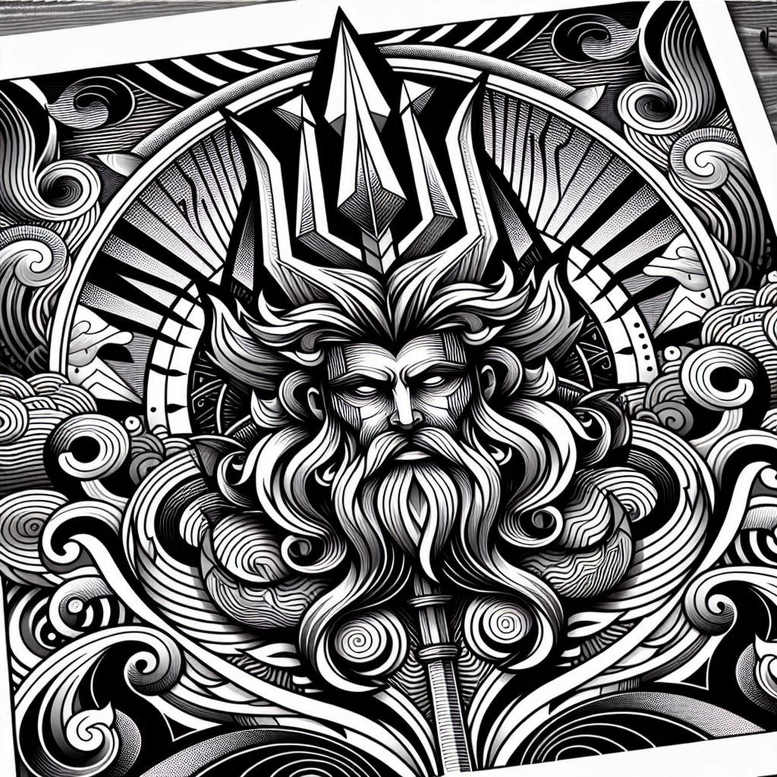 This is an AI-generated concept inspired by Poseidon from Greek mythology. The central motif is a stern, bearded god wearing a regal crown, rendered in precise linework with subtle shading to create depth without heavy blocks of ink. Surrounding him, curling waves and spiraling, mandala-like patterns weave together in a symmetrical composition that conveys movement and timelessness. The repeating geometric motifs function like a frame, nodding to ancient relief sculpture while maintaining the clarity required for a modern tattoo design. The color palette is strictly black and grey, allowing a range of skin tones to read cleanly; dense black ink at the edges provides bold contrast, enhancing durability and readability over time. The symbolism is rich: Poseidon stands as ruler of the sea, the waves signify change, resilience and the cycles of life; the crown denotes sovereignty and protection, while the radiating halo hints at divine presence and guidance. The design also nods to the idea of a trident motif subtly integrated into the crown and negative space, reinforcing identity without overwhelming the linework. For meaningful tattoos, this fine line study fuses mythology with contemporary technique, offering versatility for placement on the back, chest, or arm, and rewards close inspection with intricate detail from nearby and at distance. As an AI-generated concept, it presents a modern interpretation of classical imagery, useful for clients seeking a unique take on a sea deity. For cover-up purposes, the combination of dense line density and deep black areas makes it particularly suitable for concealing older tattoos beneath when executed by an experienced artist, while maintaining clarity of the Poseidon iconography.