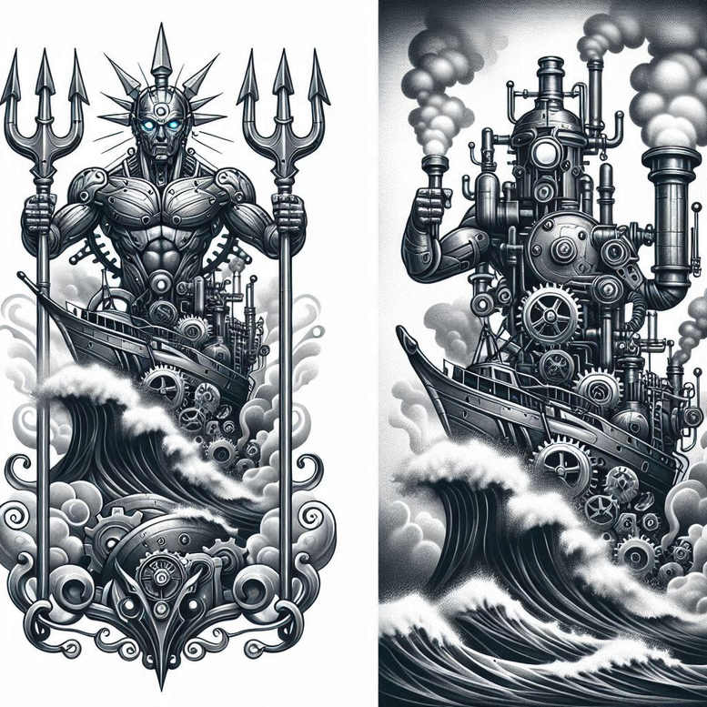 Rooted in Greek mythology, Poseidon embodies the sea’s power, protector of sailors, and master of storms. This black and grey fine-line tattoo design merges myth with mechanical imagination in a balanced, symmetrical layout: Poseidon on the left in ornate armor, his trident rising like a crown; on the right, a steampunk ship powered by gears and pipes, its smokestacks sending curls of smoke over crashing waves. The waves flow between the panels, rendered as elegant lines and stippled foam to maintain clarity in a long-lasting tattoo. Repeating motifs and a mirrored frame give a timeless rhythm, making the piece suitable for a large canvas such as a back or sleeve. Symbolically, the pairing of a divine sea god with a man-made vessel speaks to the dialogue between nature and technology—powerful forces that demand respect and mastery. The trident represents direction, control of waters, and resilience; the waves symbolize constant motion and adaptation; the ship embodies exploration, invention, and courage. For the wearer, the design narrates a personal story of navigating challenges and riding out life’s tempests, while the ornamental border enhances elegance and longevity through negative space. Given its dense black shading, the work is an excellent candidate for a cover-up if needed, and the contrast supports strong aging over time. This is an AI-generated concept study that invites a contemporary take on Poseidon’s myth, while staying faithful to tattoo design principles, including balance, legibility, and meaningful symbolism.