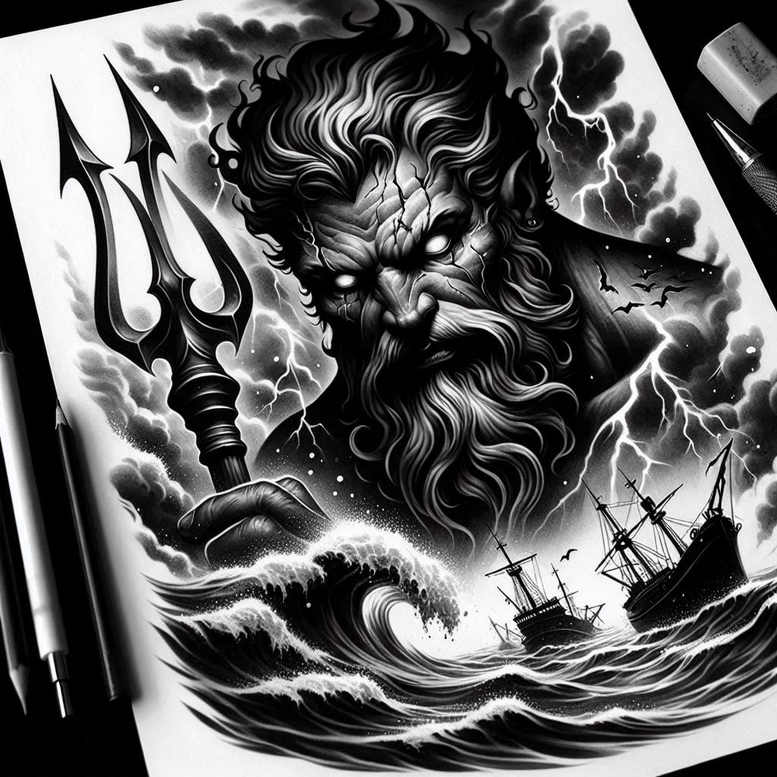 This Poseidon-inspired tattoo design draws on the mighty sea god, presenting a stern deity with a raised trident, framed by curling waves and storm-dark clouds. Rendered in black and grey, the piece relies on high-contrast shading, bold block shapes, and fine line details to suggest volume, movement, and mythic authority. The waves loop around the figure in a circular rhythm that lends the composition a timeless maritime feel, while the clouds above add a sense of epic drama and fate. The repeating pattern of wave crests functions as a decorative motif that reinforces motion and unity across the canvas, inviting close inspection of the textures in the beard, the trident prongs, and the spray of seawater captured in negative space. Symbolically, the design speaks to mastery over chaos: Poseidon as ruler of the sea, able to calm storms or unleash them, with the trident standing for sovereignty, balance, and control over natural forces. The stark black ink creates depth and a timeless edge, making the tattoo design readable at a distance and richly detailed up close. In the context of meaning and meaning-making in ink, this concept embodies themes of resilience, protection, and a reverent connection to ancient myth. Because this concept is AI-generated, it presents a bold, graphic interpretation intended for a large surface such as the chest or back; the dense blacks and deliberate negative space also render it an excellent cover-up option for previous tattoos, preserving the visual power while concealing older ink. For anyone drawn to myth-inspired body art, the piece conveys strength and wisdom through a balanced fusion of symbolism, pattern, and form, making it a compelling addition to a curated collection of meaningful tattoos in black and grey.