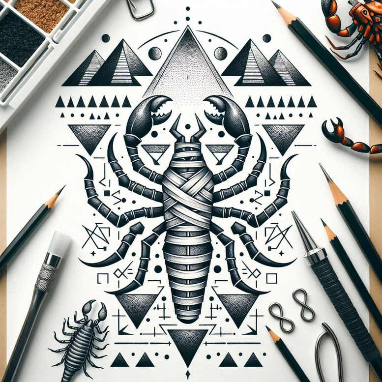 This black and grey tattoo design centers on a meticulously rendered scorpion, its body segmented with banded armor and extended claws, surrounded by an arrangement of geometric motifs that fuse triangles, circles, and angular lines with a distant mountain range. Executed in a fine line technique, the piece balances bold silhouette with delicate shading to achieve crisp definition on white skin or a light canvas, offering both visual contrast and texture. The scorpion’s symbolism—defense, resilience, and transformation—pairs with the geometric motifs to create a modern tattoo design that reads as both scientific illustration and cosmic glyph. The triangles provide a sense of order and motion, while the circles act as anchors for the composition, guiding the eye toward the central figure. The background mountain forms add depth and a sense of horizon, suggesting endurance and the journey of body art. The design’s linear precision makes it well suited for a cover-up, because the dense linework and negative space can be adjusted to mask existing ink while preserving the new image’s impact. The overall composition is versatile for placement on the forearm, calf, or back, depending on scale, and it can be adapted to suit a client’s preferences for scale, density, and alignment. Crafted as an AI-generated tattoo project, this concept invites tattoo enthusiasts to imagine a longer sleeve, a half-sleeve, or a standalone study in geometric realism. In terms of style and technique, the piece exemplifies fine line tattoo aesthetics, black and grey shading, and geometric precision, aligning with contemporary trends in tribal-inspired and Japanese style tattoo, as well as inking practices across the tattoo world. The design’s meaning can be amplified by pairing with additional symbols, such as an infinity symbol or lotus motif, to express personal growth, protection, and eternal cycles. As a practical option for a cover-up, the composition can be scaled and darkened to ensure excellent ink coverage while maintaining crisp detailing, making it an attractive choice for clients seeking a bold, modern tattoo design with meaningful symbolism and enduring appeal, and it stands as a strong example of an AI-generated tattoo project.