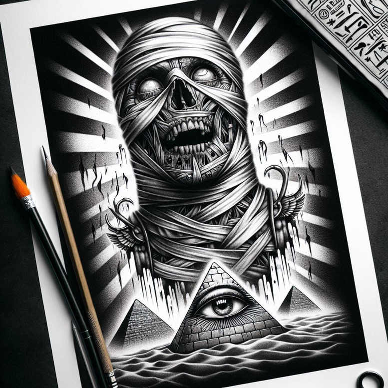 An AI-generated tattoo project presented in black and grey, this design centers on a skull wrapped in torn bandages, its toothy grin rendered with meticulous cross-hatching and soft gradients to create a lifelike yet stylized surface. Behind and around the figure rise radiating lines that push the composition outward, while a pyramidal form anchors the lower portion of the image and bears a piercing all-seeing eye, a motif rich with mystery and connotations of hidden knowledge. At the base, stylized waves roll across the horizon, reinforcing a sense of depth and creating a subtle counterpoint to the rigid geometry above. The bandages sculpt the skull as a three-dimensional silhouette, catching highlights and shadow to emphasize form and texture, while the eye within the pyramid acts as a focal point that pulls the gaze toward themes of perception, fate, and surveillance. The overall composition balances dense texture with negative space, allowing for clear readability on skin while providing enough darkness to camouflage prior ink, making it an attractive option for a cover-up. The piece leans into black and grey realism with strong line work, crisp edges, and smooth shading that translate well from digital concept to tattoo execution, suitable for both large canvases and smaller placements. As an AI-generated tattoo project, it reflects contemporary digital artistry fused with traditional iconography, offering meaningful tattoos for collectors who appreciate occult symbolism, geometric forms, and western world imagery like pyramids and the all-seeing eye, while remaining adaptable as a custom tattoo design. The motifs—skull, bandages, pyramid, eye, and wave—together convey mortality, protection, watchfulness, and motion, making this design a versatile statement piece that can be scaled, reworked, or combined with other elements in the same black and grey palette.
