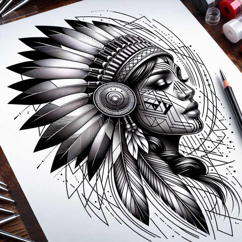 This black and grey illustration presents a Native American headdress as a bold tattoo design, blending ornate feather work with geometric facial patterns. Executed with precise linework and nuanced shading, the piece relies on high-contrast black ink to preserve legibility on skin while preserving delicate details in the plumes and the circular ear ornament. The crown of the headdress fans outward, with layered quills defined by crisp edges and subtle cross-hatching to convey texture and movement. A circular disc near the ear anchors the composition, surrounded by beads and flowing strands that intertwine with the feathers. The face portion is treated with geometric facets and angular shading, creating a contemporary tribal aesthetic that sits comfortably in both traditional and modern tattoo contexts. Circular motifs and radial lines frame the subject, lending balance and rhythm while negative space around the outer rings enhances readability and contributes to a dynamic silhouette. From a technique standpoint, the design demonstrates controlled gradients, bold fills, and a mix of fine-line details with solid black areas—an approach well suited for smooth skin application and lasting ink. The symbolism is rich: the headdress suggests heritage and honor, the feathers symbolize growth and courage, and the geometric facets invite personal interpretation. As an AI-generated tattoo project, the artwork benefits from precise, repeatable geometry and a clean, graphic look that also works well as a cover-up option when existing tattoos are dark or dense. This piece aligns with trends in tattoo design that fuse meaningful tattoos with style-forward geometry, offering a versatile option for custom tattoo design, black and grey ink, and bold body art. Its note of elegance and power makes it appealing to collectors seeking small to medium-scale work that retains impact at a distance. The composition translates well to skin, with scope for adaptation across placements and scales.