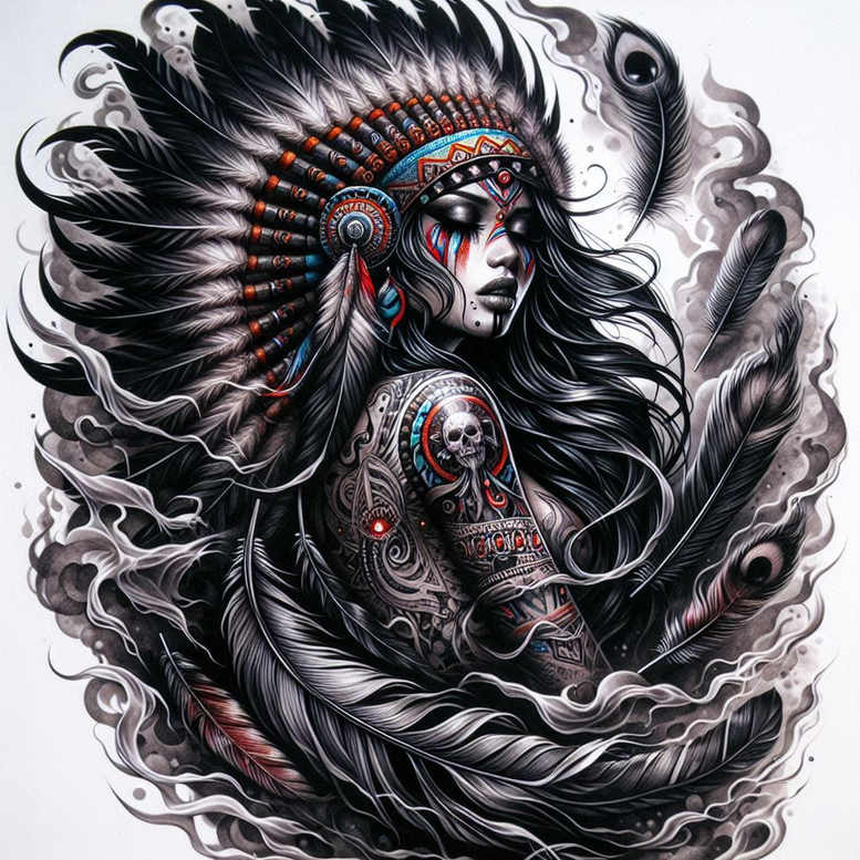 An AI-generated tattoo project depicting a black-and-grey tribal-inspired portrait of a woman in a feathered headdress, executed with dense linework and sweeping negative space. The composition centers on the profile of the figure, her long hair curling around the shoulder while a full plume of feathers radiates outward, each feather rendered with crisp, tapered lines and strategic inking to create texture and depth. On the exposed arm, an ornate sleeve combines geometric motifs with a skull centerpiece, forming a contrasting focal point that anchors the scene and hints at themes of endurance and memory. Subtle red and turquoise accents in the headdress beads provide restrained color that punctuates the monochrome base without overpowering the design, reinforcing the balance between realism and stylized symbolism. A smoky, cloud-like backdrop swirls around the figure, guiding the viewer’s eye through the tattoo and enhancing the sense of motion as hair sails with implied wind. The overall effect is a bold, high-contrast piece that demonstrates how black and grey shading can render complex patterns, depth, and emotion in a single composition suitable for a cover-up. The design plays with fine-line detailing, heavy black blocks, and negative space to conceal preexisting marks while offering a fresh, legible narrative on skin. It draws from tribal tattoo aesthetics and Japanese-style influences in its disciplined line economy, yet remains distinctly contemporary through its portrait orientation and ornamental sleeve work. This makes it a meaningful tattoo design for clients seeking a dramatic, story-rich body art creation, capable of turning a difficult canvas into a cohesive, long-lasting statement. Key elements include the woman’s profile, feathered headdress, flowing hair, feather accents, arm sleeve with skull and geometric patterns, and the smoky background. In sum, this AI-generated tattoo project embodies a powerful cover-up-ready black-and-grey piece that marries pattern, symbolism, and technical finesse for a standout tattoo design.