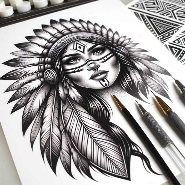 This black-and-grey tattoo design presents a portrait of a woman in a grand feather headdress. Crisp linework defines each feather, the decorative headband, and the facial markings, while subtle dot shading builds depth in the cheeks, nose, and hair. The nose ring adds a contemporary accent, and the flowing strands frame a poised, intense gaze that communicates resilience and quiet authority. The upper background includes geometric pattern motifs that echo tribal and Japanese-inspired aesthetics, creating a pattern-rich overall silhouette that reads well in both large-scale and compact forms. The composition balances solid blacks with delicate gradients, making it versatile for a back piece, shoulder panel, or a refined forearm tattoo. Symbolically, the feathers evoke wisdom, spiritual protection, and a connection to ancestral heritage, while the face paint suggests rites, identity, and personal meaning; the nose ring adds an edge of modernity. As a concept, this is an AI-generated tattoo project intended for artists to refine and customize; depending on placement, it can serve as a strong cover-up piece when addressing older or darker ink due to its bold negative space and dense shading. Technically, the design relies on high-contrast black ink, clean linework to delineate plumage and facial features, and controlled stippling to achieve texture in the plumage and skin, with cross-hatching used sparingly to suggest volume where needed. The motifs align with contemporary tattoo design trends in fine line, black and grey realism, tribal, and Japanese-inspired body art, offering a versatile template for meaningful tattoos, whether a small pattern of feathers or a dramatic full-sleeve statement. The image also showcases how AI-generated tattoo projects can inspire tattoo studios to explore bold, graphic concepts that front-load impact while leaving room for artist adaptation. In short, this piece embodies core tattoo design values: monochrome contrast, precise linework, symbolic significance, and enduring appeal for ink enthusiasts seeking timeless body art. Keywords to consider include tattoo, tattoo design, meaningful tattoos, fine line tattoo, tribal tattoo, Japanese style tattoo, black and grey, realistic tattoo, ink, lotus flower tattoo, rose tattoo design, and custom tattoo design.