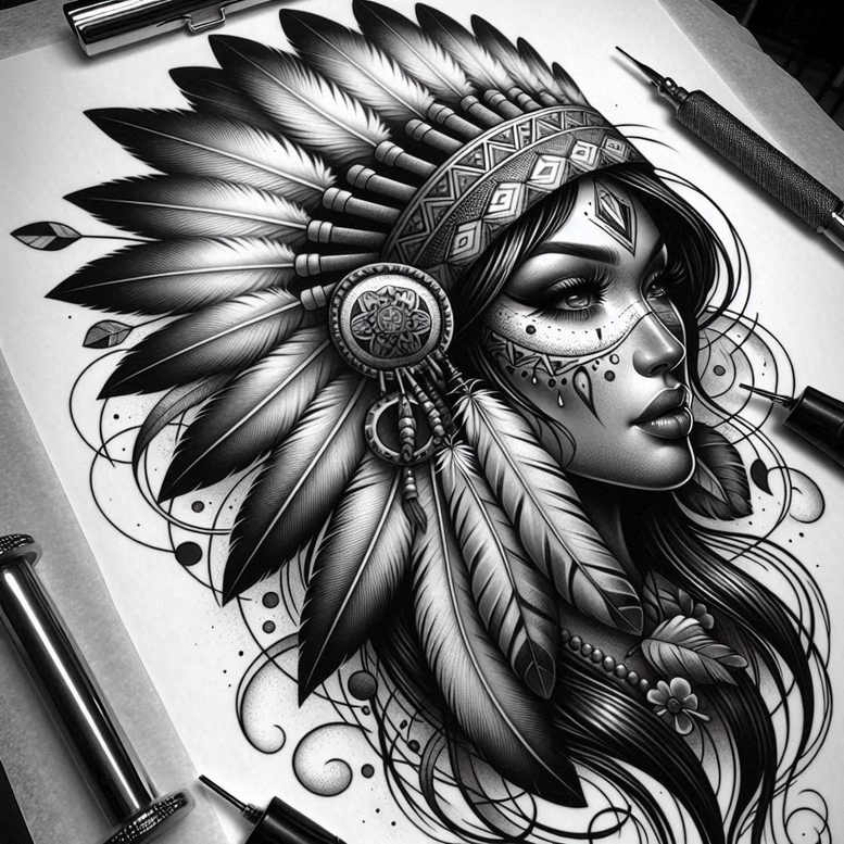AI-generated tattoo project concept presented as a monochrome study of a female portrait wearing a Native-inspired feather headdress. The composition centers on a poised profile, the gaze directed outward, with a dramatic fan of feathers sweeping behind the head. Crisp line work defines the ornamental headband, while geometric motifs on the band create a rhythm of triangles and diamonds that echo traditional patterns. Subtle stippling and smooth gradient shading sculpt the face, giving volume to the cheek, nose, lips, and eyelids, and lending a lifelike quality to the expression while maintaining a stylized tattoo aesthetic. The feather textures range from ultra-fine lines to solid black silhouettes, achieving depth and motion as each plume curves with natural geometry. A circular medallion at the earlobe and curling tendrils of linework around the temple contribute decorative balance, while a small flower motif softens the composition at the neck. The piece unifies realism with ornamental design, making it suitable as a centerpiece for shoulder, back, or sleeve work; its black and grey palette ensures strong contrast on skin and easy adaptation to existing ink. As an AI-generated project, this concept illustrates how modern tattoo design can blend fine line precision with bold silhouette, offering meaningful tattoos that celebrate nature and heritage-inspired symbolism. Keywords such as tattoo, tattoo design, meaningful tattoos, fine line tattoo, tribal tattoo, rose tattoo design, custom tattoo design, Japanese style tattoo, black and grey, realistic tattoo, body art, ink are integrated to support search and portfolio presentation. The piece emphasizes pattern through the headband geometry and feather arrangement, inviting the tattoo artist to translate the motif into a wearable, personal narrative.