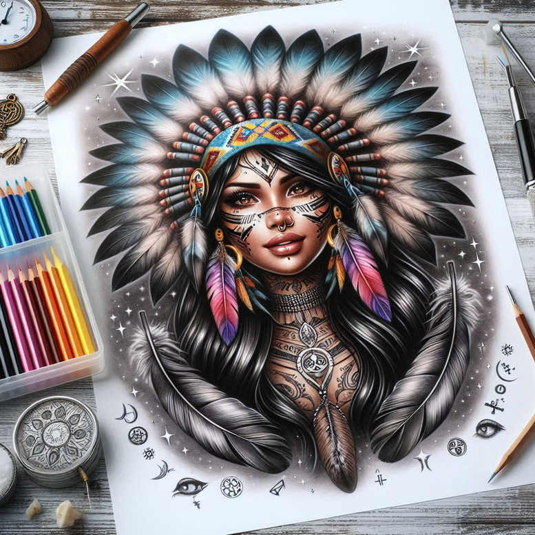 An intricately rendered portrait tattoo concept presents a woman wearing a ceremonial Native American headdress, where the row of feathers arcs outward in a spectrum of teal, blue, and earthy browns. The subject’s face is etched with geometric tribal-inspired markings that flow seamlessly into a necklace-like chest composition, creating a cohesive center of gravity for the piece. The artwork emphasizes fine line precision, smooth gradient shading, and a realistic rendering of hair, jewelry, and fabric textures, all executed in a rich palette that reads as a finished tattoo design. The pattern-driven motifs on the face and chest serve as symbolic elements—ancestral ties, protection symbols, and spiritual pathways—while the feather plumage adds movement and depth. This concept leans into contemporary tattoo design with a graphic yet naturalistic approach, balancing bold black outlines and nuanced color transitions to achieve a vibrant, wearable body art piece. The piece can be executed as a standalone full-color tattoo design or adapted to a black-and-grey palette for a subtler, classic look. It showcases how tribal and ceremonial motifs can be fused with modern rendering techniques to produce a meaningful tattoo that honors heritage while remaining visually impactful. For clients seeking a style that blends realism with graphic patterning, this design offers ample room for personalization—adjusting the feather palette, refining line weights, or shifting the face markings to reflect personal symbolism. From a tattoo artist’s perspective, the composition prioritizes readability on the skin, with the headdress framing the face and guiding the eye toward the center chest motif. As an AI-generated tattoo project concept, this illustration demonstrates the potential of algorithmic inspiration in shaping future custom tattoo designs, while staying faithful to the core tattoo vocabulary: fine line tattoo, tribal motifs, and bold color work. Suitable for clients seeking meaning through floral and geometric symbolism, the piece can be adapted for small tattoos or scaled into a larger body of work, depending on placement and skin tone. The result is a versatile, pattern-rich tattoo design that invites personalization and storytelling.