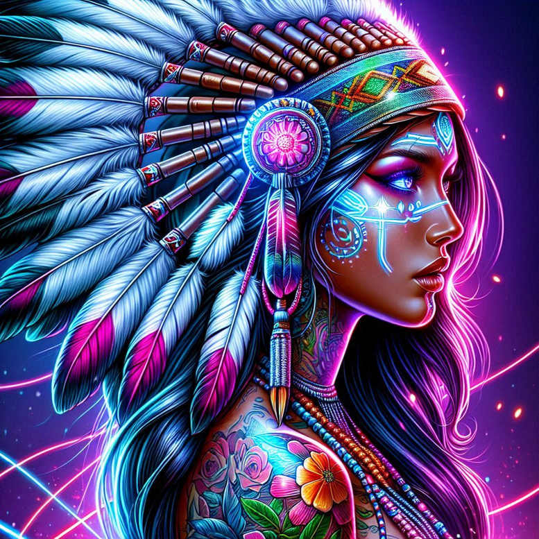 This AI-generated tattoo project showcases a vibrant neon portrait anchored by an ornate Native headdress. The central image is a profile of a woman whose long hair frames a feathered headdress, each feather rendered in blue, white, and pink hues to create a luminous cascade. A multicolor headband and a beaded necklace establish a ceremonial tone, while a tattoo along the shoulder reveals a lush bouquet of flowers, including roses and tropical blooms, interwoven with curving vines. Neon linework traces across the face and neck in cyan and magenta, forming geometric and tribal-inspired motifs that echo cultural symbolism while remaining respectful and stylized. The piece employs a mix of bold outlines and soft color shading to deliver a dynamic, glowing look that reads as a full-color tattoo design on the skin. Techniques draw from digital illustration aesthetics and influences of fine line tattoo, with careful attention to line weight, negative space, and rhythm across the composition. The floral elements symbolize growth and resilience, while the headdress nods to lineage and tradition; the neon glow suggests energy and renewal, making this a meaningful tattoo concept for a larger canvas such as the shoulder or sleeve. This design positions itself at the intersection of flower tattoos, Japanese style tattoo-inspired silhouettes, and tribal-inspired motifs within a modern color palette, embodying a bold, memorable body art statement. For tattooists and clients, it demonstrates how custom tattoo design can fuse ceremonial symbolism with contemporary color studies, while AI-generated tattoo projects like this expand the toolbox for meaningful tattoos, pattern-driven compositions, and vibrant flower tattoos.