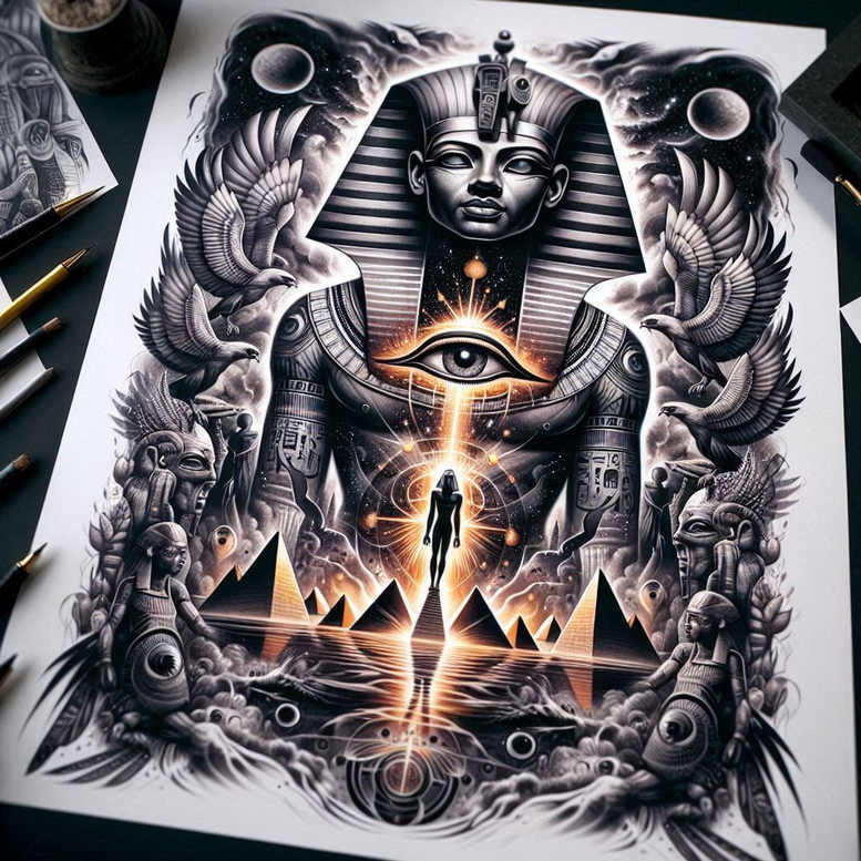 An AI-generated tattoo project that translates an ancient Egyptian icon into a sprawling, dreamlike composition with modern precision. Executed in black and grey, the central pharaoh figure rises from a skyline of pyramids and a reflected shoreline, while an all-seeing eye sits between beams of luminous energy that descend from a lofty crown. Two expansive wings sweep beside the figure, their feathers rendered with meticulous linework and nuanced shading to convey motion, reverence, and power. The horizon opens into jagged silhouettes, obscured by drifting clouds and a scattering of stars, then anchors the eye to a radiant core where light erupts along a vertical axis toward the top of the composition. A lone silhouette advances along the radiant path, suggesting ascent, revelation, or pilgrimage, and providing a focal point for storytelling within the ink. The design embraces graphic patterns within the architecture and negative space—an homage to modern tattoo patterning—while preserving a realistic tonal range that reads clearly in black and grey. The overall effect is monumental and cinematic, blending mythic symbolism with contemporary line density; it functions as a bold tattoo design suitable for large-scale applications, from full-back canvases to sturdy sleeve formats. While the palette intensifies the drama, the restrained color scheme ensures crisp contrast, making this piece an outstanding choice for a cover-up that can elegantly obscure older work while introducing a fresh narrative. This concept nods to Japanese style tattoo dynamics and tribal tattoo sensibilities through its composition, while remaining adaptable as a custom tattoo design for clients seeking meaningful tattoos, lotus or flower motifs, or a stark infinity tattoo feeling embedded in a black and grey frame.