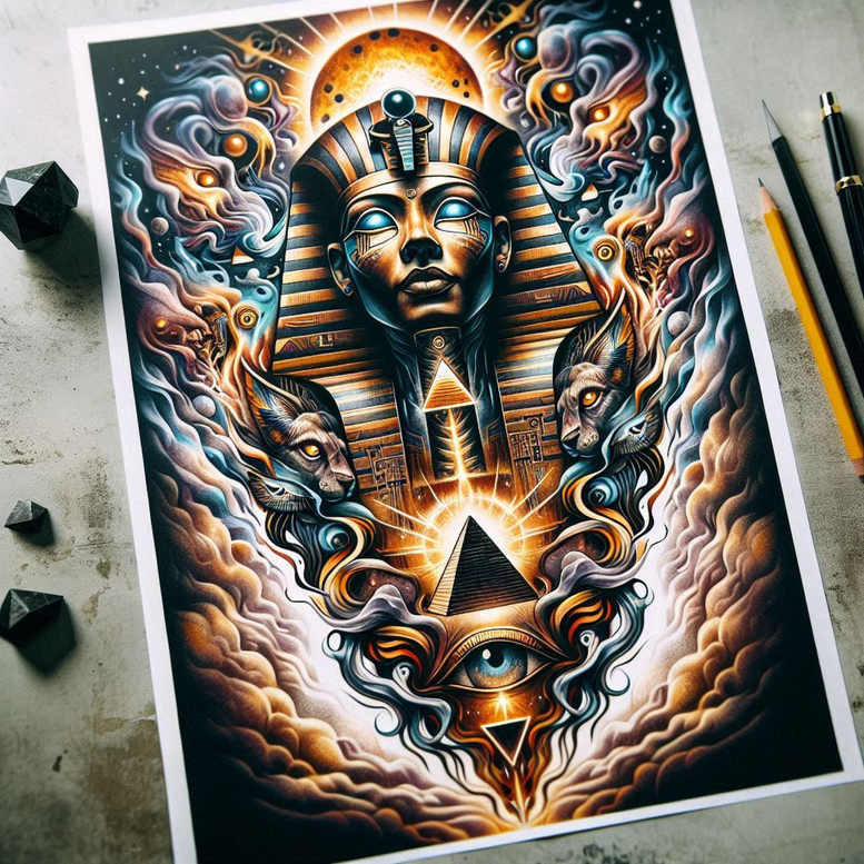 This is an AI-generated tattoo project: a vibrant, Egyptian-inspired composition that blends ancient iconography with contemporary tattoo technique. A central pharaoh head wearing a golden nemes headdress rises above a glowing pyramid, while a radiant sun erupts behind, casting light through stylized clouds and spiraling geometric ribbons. The color palette is saturated and luminous—gold and caramel for the pharaoh, electric blues and teals for the headdress accents, warm oranges for the sun, and deep shadows that give depth to every fold of fabric and stone. Crisp line work defines the key forms, with fine-line detailing used to render delicate hieroglyph-like motifs and subtle gradient shading used to model skin and stone surfaces. The piece employs graphic patterns in the surrounding atmosphere—triangles, chevrons, and curvilinear ribbons—that create a pattern-rich frame while maintaining clarity on skin. The composition favors a vertical layout, making it well-suited for back, sleeve, or chest placements, and ensuring good readability from distance. Symbolically, the pharaoh implies authority and guardianship, the pyramid stands for stability and ascent, the eye motif adds vigilance, and the sun embodies vitality and renewal, inviting a dialogue between heritage and personal meaning. For tattoo enthusiasts, this is a meaningful tattoo design that can be adapted to different sizes and skin tones, with sensitivity to line weight and color longevity. The concept demonstrates how AI-generated tattoo projects can inform and inspire custom tattoo design, offering a starting point that tattoo artists can tailor to individual styles, whether leaning toward Japanese-inspired balance, tribal energy, or a more realistic rendering in black and grey if desired. Although bright and dynamic here, the artwork also translates well into monochrome variations for those seeking a timeless, high-contrast tattoo. The evolving technology behind AI-generated art continues to expand the palette of possibilities for body art, enabling clients to explore mythic narratives through ink while maintaining personal resonance and practical durability.