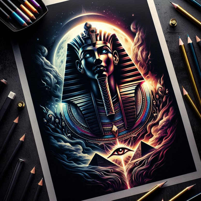 This AI-generated tattoo project presents a bold, color-forward reimagining of ancient Egyptian iconography. At the heart of the composition is a pharaoh’s face adorned by a blue-and-gold nemes headdress, its stripes rendered with crisp linework and subtle shading that give the mask a sculptural feel on skin. A ceremonial beard and a stylized collar read as jewelry, while a luminous Eye of Pyramid motif sits beneath the chin, framed by geometric flames that erupt in electric orange and cobalt blue. The backdrop remains deliberately dark, creating strong contrast where every line, gradient, and highlight must hold its own, a choice that makes this piece particularly suitable as a cover-up for existing tattoos. The design leans toward a realistic yet highly decorative aesthetic, blending Japanese-inspired attention to technical detail with graphic patterning that reads well at large scales. The color palette—rich blues, golds, purples, and hot pinks—was chosen to maximize skin tone response and ink longevity, with shading that moves from crisp edges to soft transitions to mimic depth and volume. Key elements are rendered with layered textures: the headdress’s woven bands, the beaded necklace, and the intricate chevron motifs on the chest provide visual interest without sacrificing readability on smaller placements. While rooted in timeless symbolism—Egyptian iconography, eye symbolism, and a hint of mysticism—the piece also nods to contemporary tattoo design through bold silhouette, clean negative space, and scalable composition. This makes it a strong candidate for a custom tattoo design meant to convey meaning and power, whether the wearer seeks protection, identity, or a statement piece. In the broader context of ink artistry, it aligns with tattoo, meaningful tattoos, fine line tattoo references, and black and grey cues, even though color dominates; for collectors, it offers a rich starting point for personal narrative, such as reimagining a lotus flower tattoo or rose tattoo design in an Egyptian mode. Given its heavily dark groundwork and bright chroma, the piece also showcases its suitability as a cover-up option, reinforcing its function as a powerful body art statement and a pattern-rich option for future expansions.